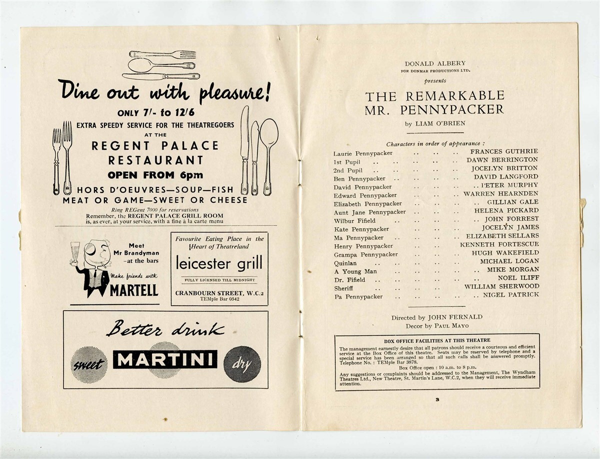 The Remarkable Mr Pennypacker Program. from the New Theatre in London England in 1953.