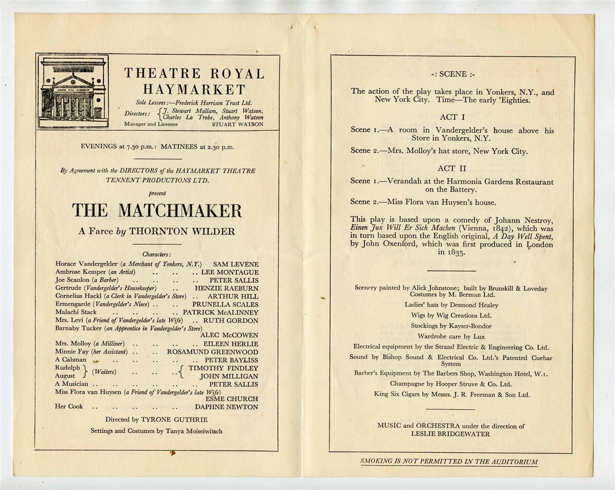 The Matchmaker Program , a farce by Thornton Wilder . From the Royal Haymarket Theatre in London England in 1954. Starring Sam Levene, Arthur Hill and Ruth Gordon