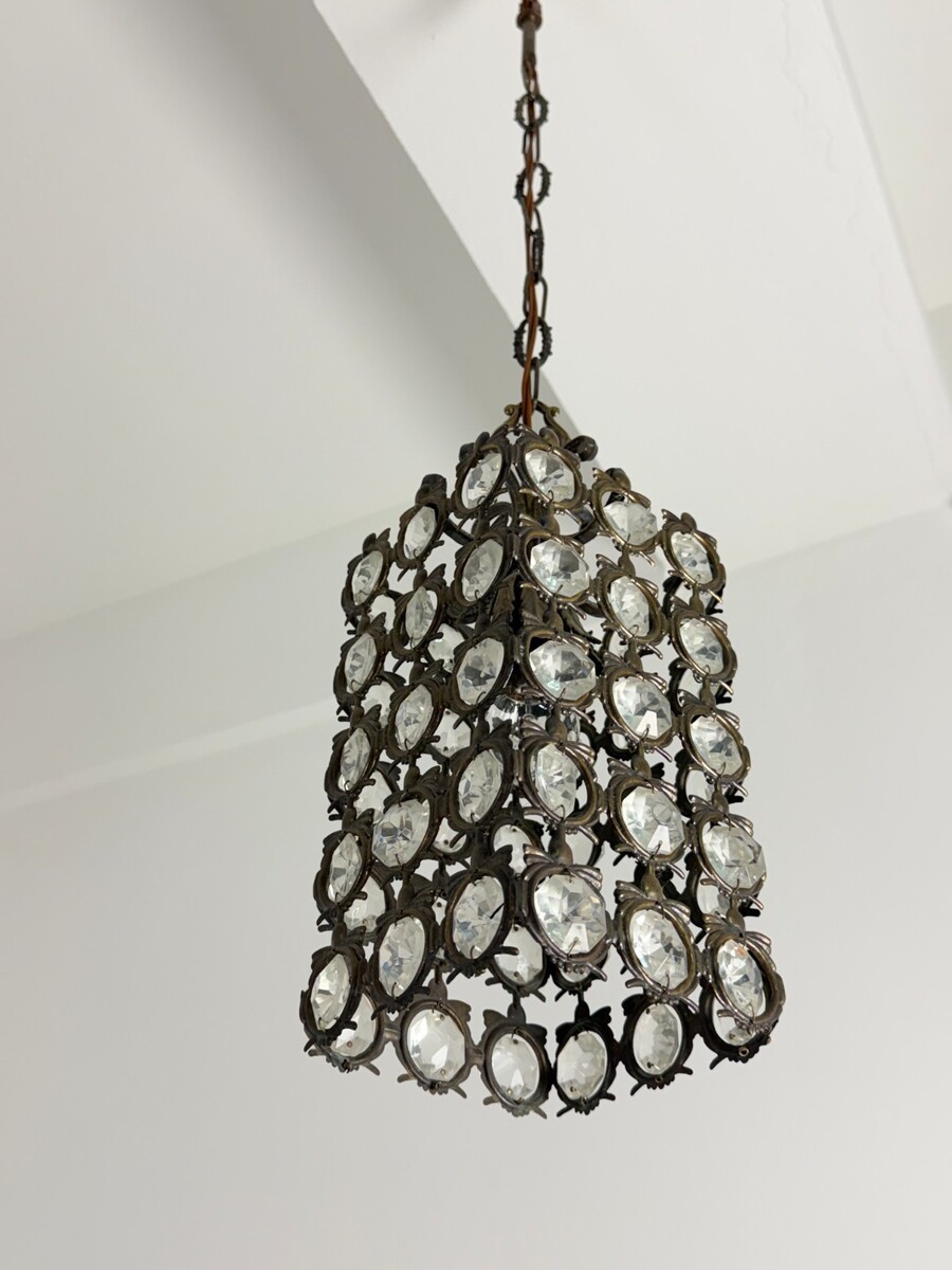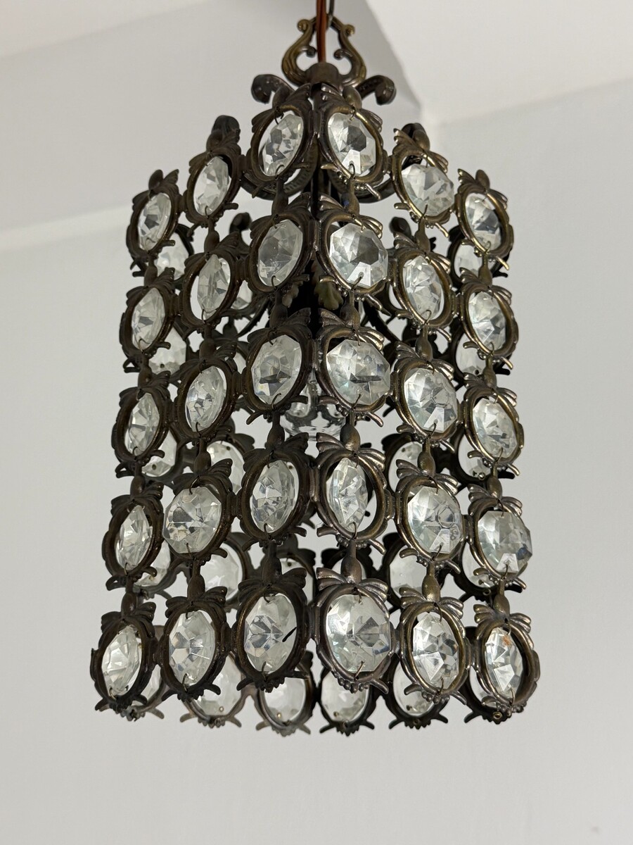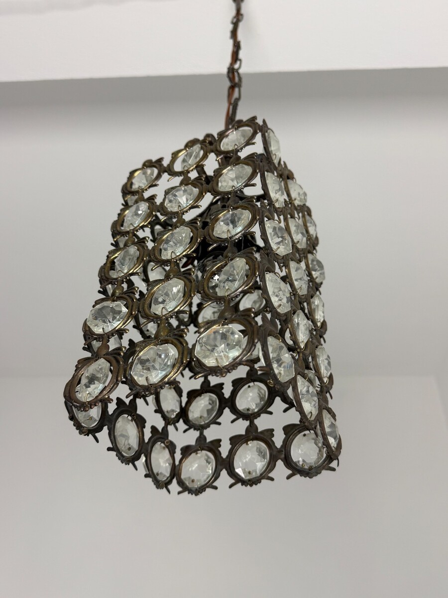 Piccolo lampadario italiano mid-century in bronzo e cristalli, anni '40.