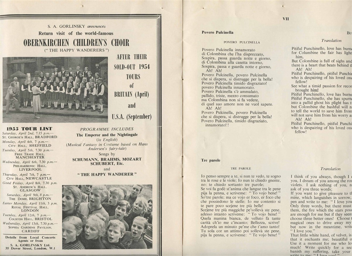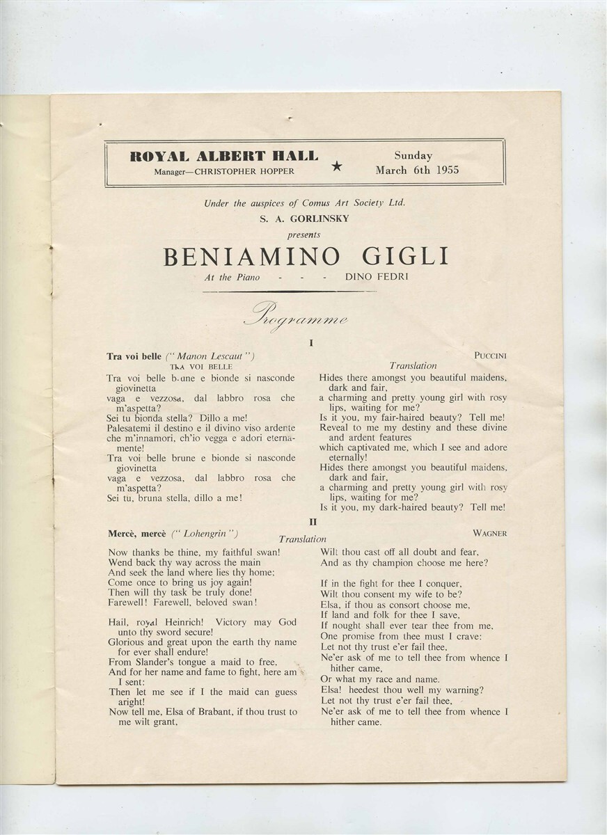 Beniamino Gigli Program from the Royal Albert Hall in London England on March 6, 1955. With programme in Italian and english