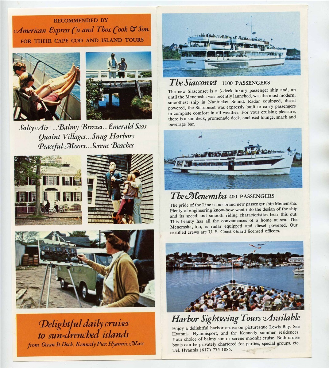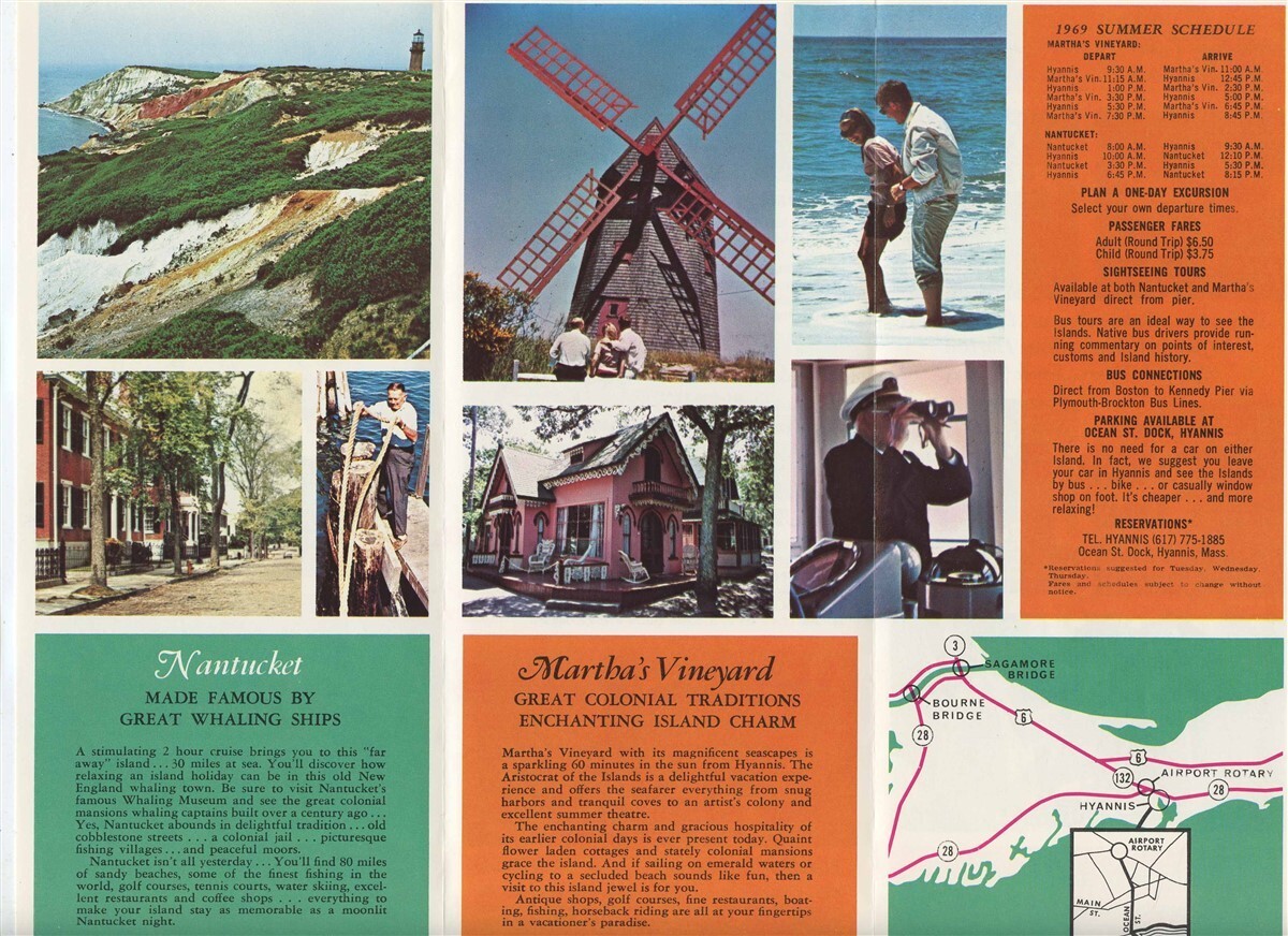 A 6 panel fold out brochure with map, pictures and facts about the ships, facts about the Islands, ship photos, schedule, fares, area map, port photos and more. Nantucket Martha's Vineyard Cruises Brochure on the Siasconsett and The Menemsha , leaving from Hyannis Massachusetts