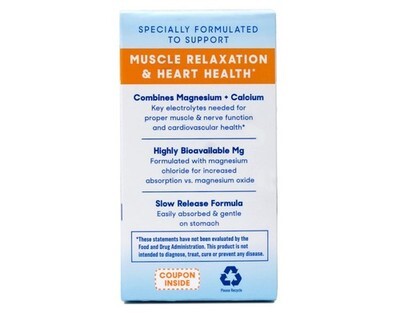 2 Pack Expiration Date of 03/2026+ ? Contains 64 mg of elemental magnesium per tablet ? Magnesium chloride for increased absorption compared to magnesium oxide ? Each serving includes 212 mg of calcium to support strong bones and teeth ? Enteric coating helps prevent stomach upset ? Slow-release formula ensures gradual release of magnesium and calcium over time ? Unflavored tablets free of artificial flavors and colors ? Supports muscle relaxation, heart health, and bone strength