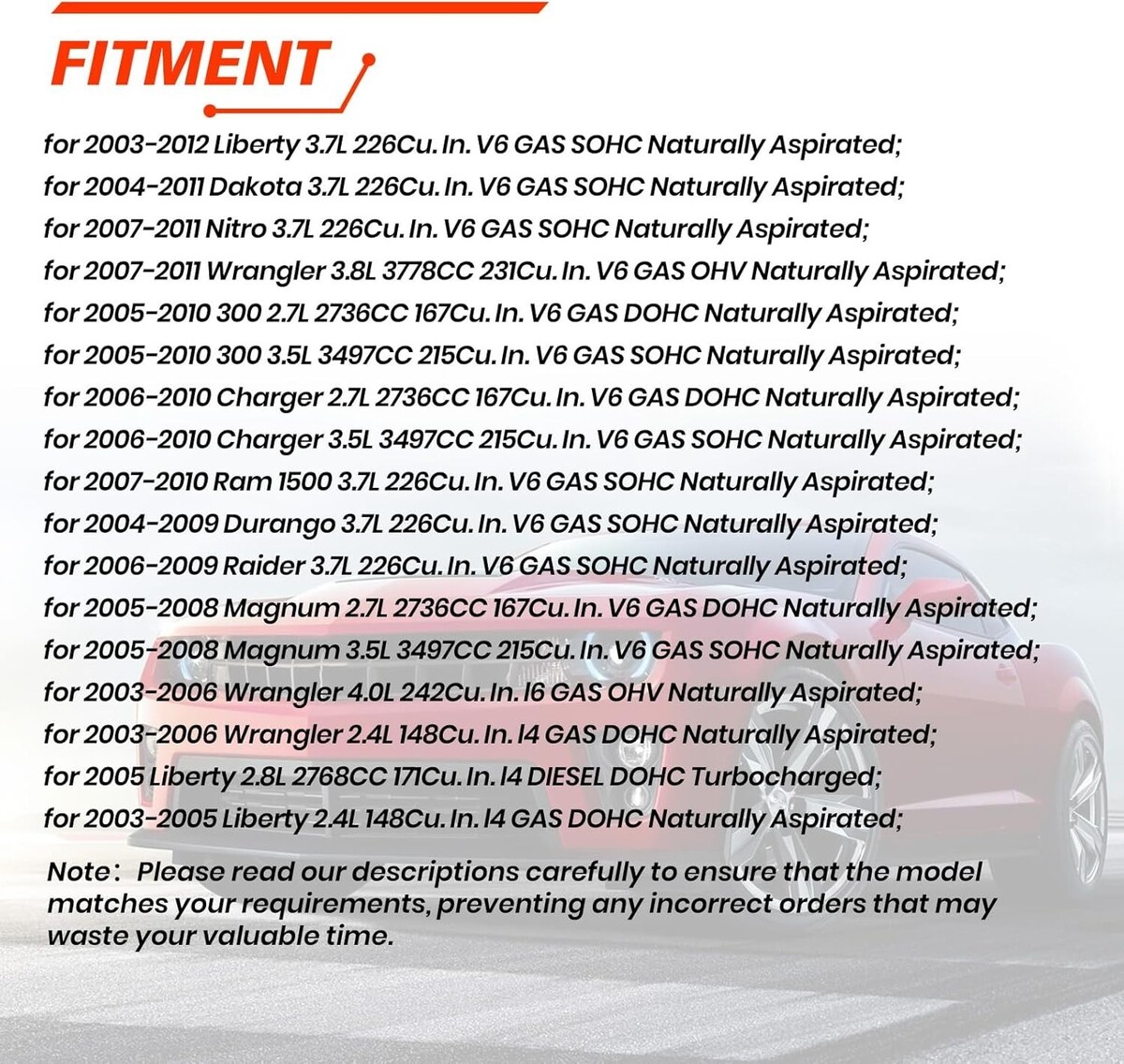 ?Compatible With?For 2003-2012 Liberty 3.7L, for 2004-2011 Dakota 3.7L, for 2007-2011 Nitro 3.7L, for 2007-2011 Wrangler 3.8L, for 2005-2010 Chrysler 300 2.7L. Please read our descriptions and pictures carefully to ensure that the product's applicable model is the same as your needs, so as not to place the wrong order and waste your precious time.
