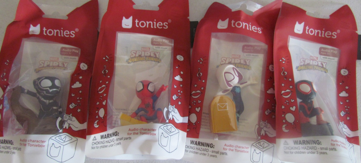 This bundle includes the Gray Toniebox plus four Marvel Spidey and His Amazing Friends Tonies, exactly as shown in the photos.