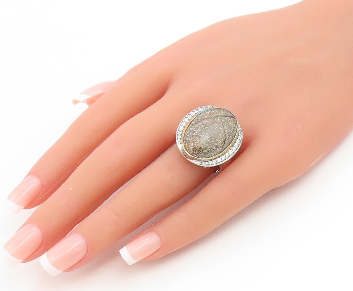925 Sterling Silver Vintage Ring Oval Gemstone & CZ Statement Band Sz 9 RG35043