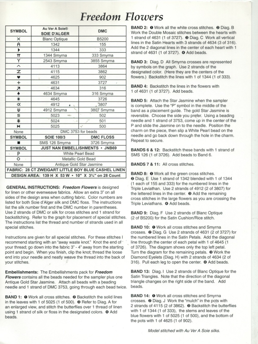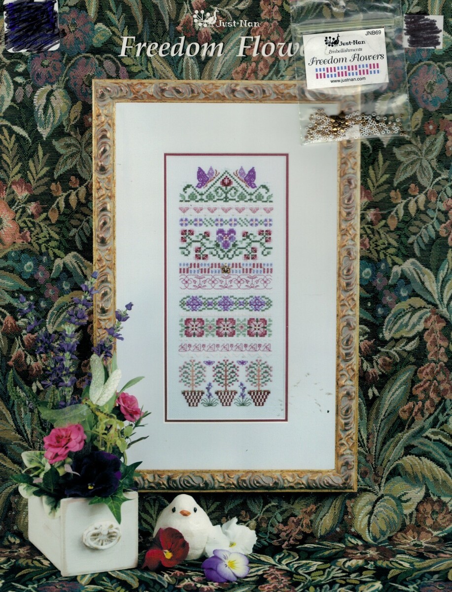 Just Nan Freedom Flowers Counted Cross Stitch Chart w/ Embellishment Pack JN119