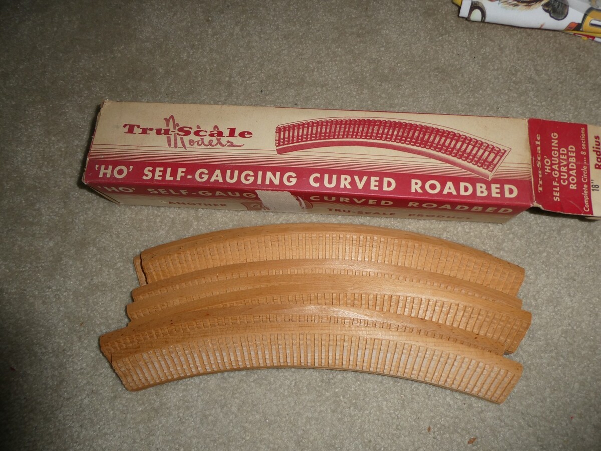 You are bidding on a vintage HO scale Tru Scale Models, pack of 8 wood curved roadbeds in box in the picture. 18" radius, complete circle. Each section is about 15 inches long. Appear unused in worn box. Zoom in for details.