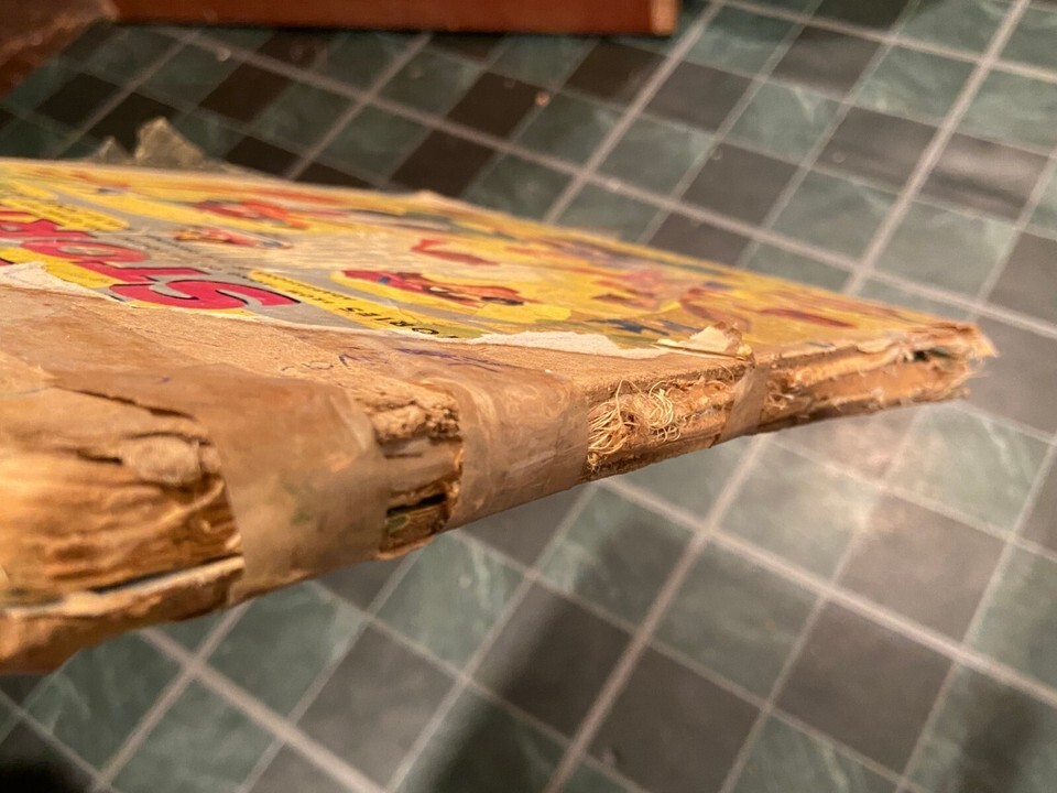 The cover is in bad shape with the whole cover and back barely hanging on. I see someone had taped the cover to help it stay but there are some strings of binding still holding onto the cover