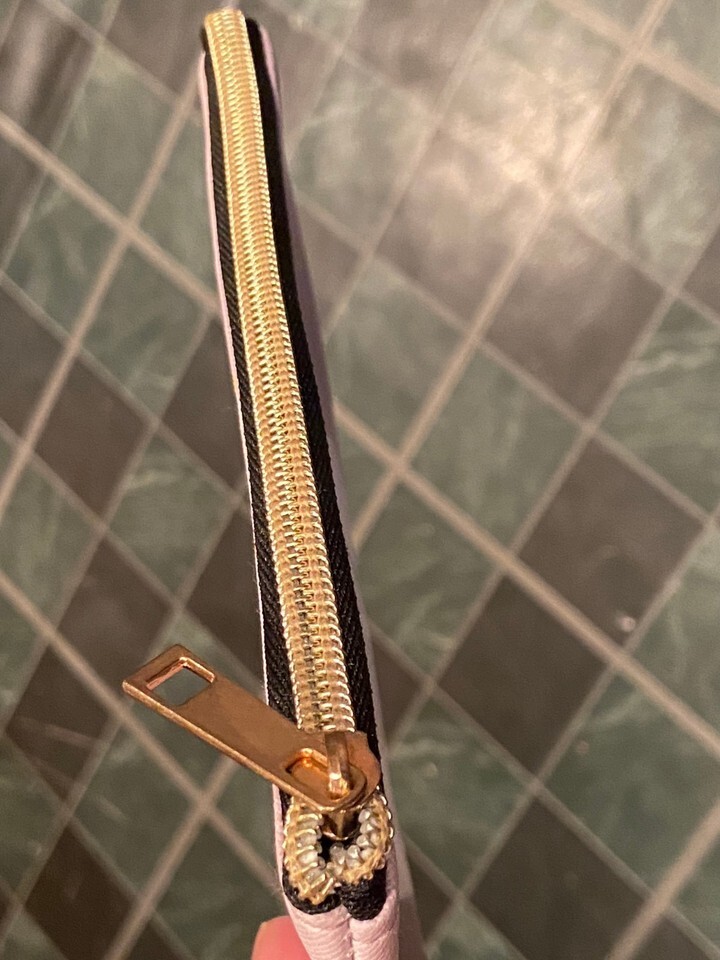 The makeup bag is pre-owned in nice condition. It has the polar bear picture on both sides. It has a zipper opening and a clean inside. On the side are two small compartments.