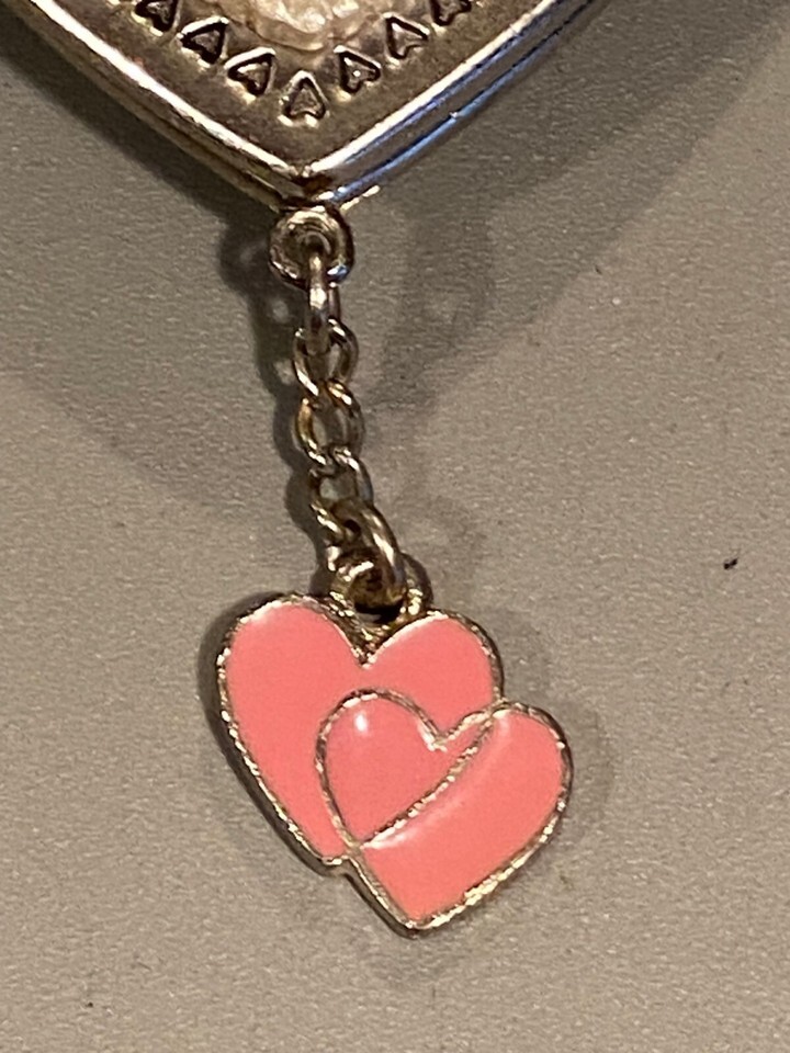 It hangs from a pink ribbon and is heavy metal. It has 2 joined hearts dangling from the bottom of the ornament
