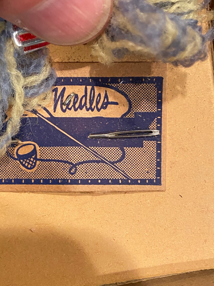 The weaving set is pre-owned. It looks like everything is there. It has the frame and the thread which haven't been used as well as different patterns. There are 2 needles on the package backing.