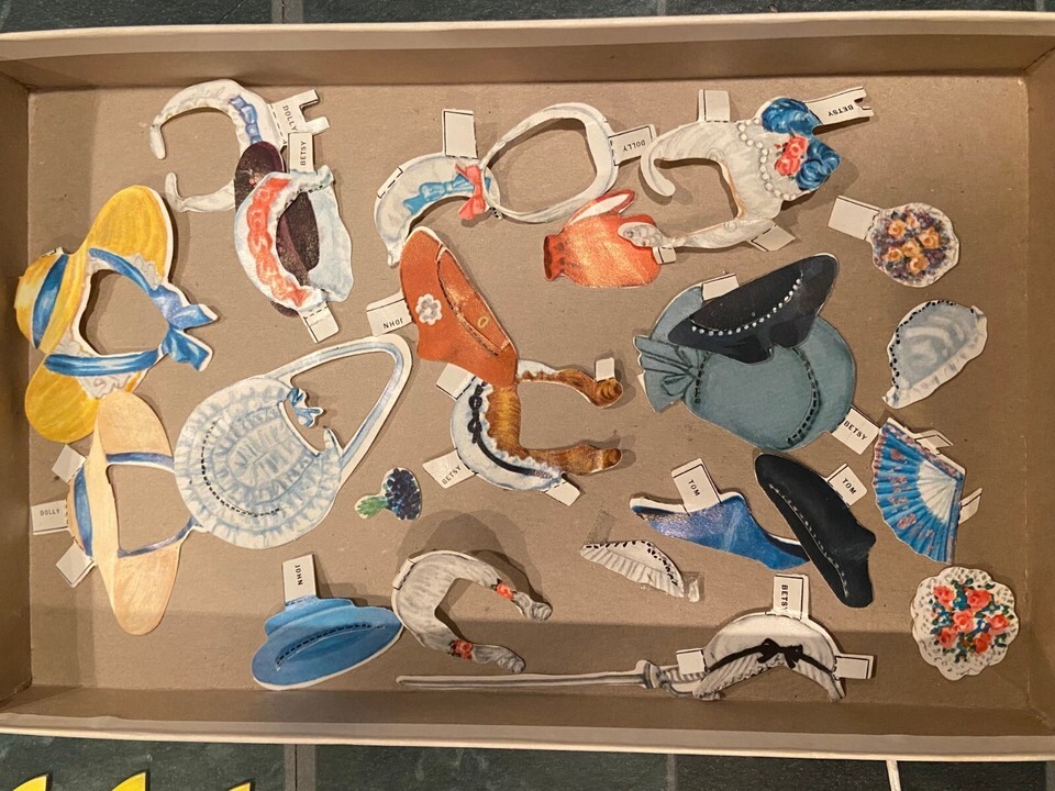 The paper dolls set is pre-owned and all the outfits are pushed out