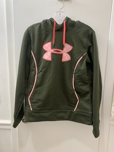 The Under Armour Coldgear Big pink Logo Hoodie in women's small army green is a stylish and comfortable activewear piece perfect for casual wear or various performance activities. Made with polyester fleece lining, this relaxed fit hoodie features a high neckline and long sleeves, making it ideal for the winter, summer, fall, and spring seasons. The pullover style with the Under Armour logo accents adds a touch of trendy flair to this wardrobe essential. New without tags. Love the green and pink color combo. It?s very fitted. Size small. Has pockets