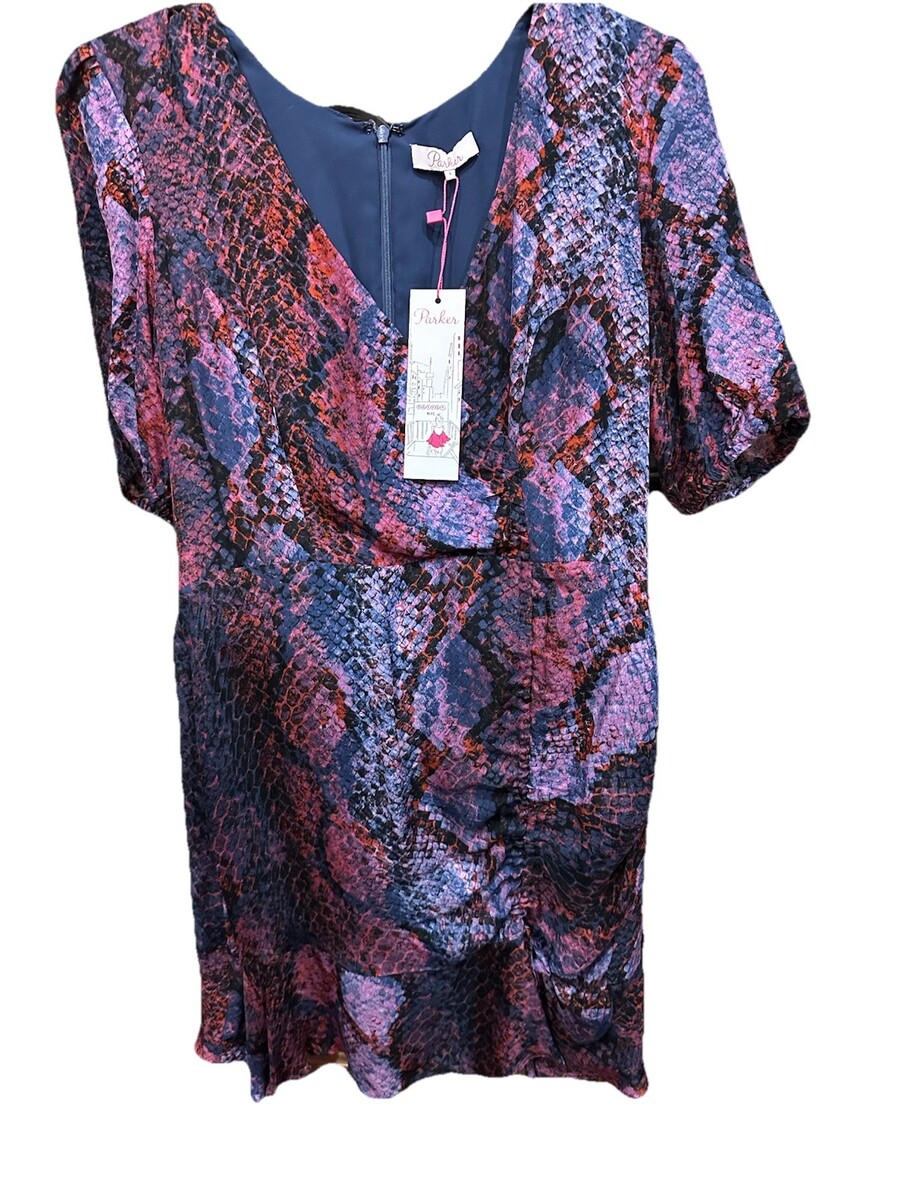 Gorgeous Feminine, flattering, and effortlessly chic, this Parker Krislyn mini dress in luxe silk features a vibrant snake print, ruched details, and a modern silhouette perfect for weddings, brunch, or a summer night out, date night with significant other