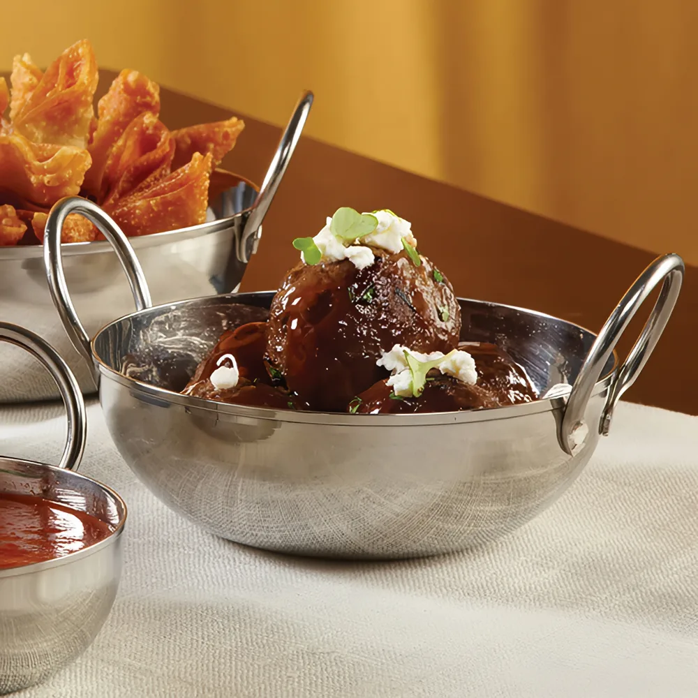 It is made of corrosion-resistant, durable stainless steel with a mirror finish that provides an attractive, upscale presentation. The dish has large loop handles on opposite sides that make it easy to transport and add visual interest to its appearance.