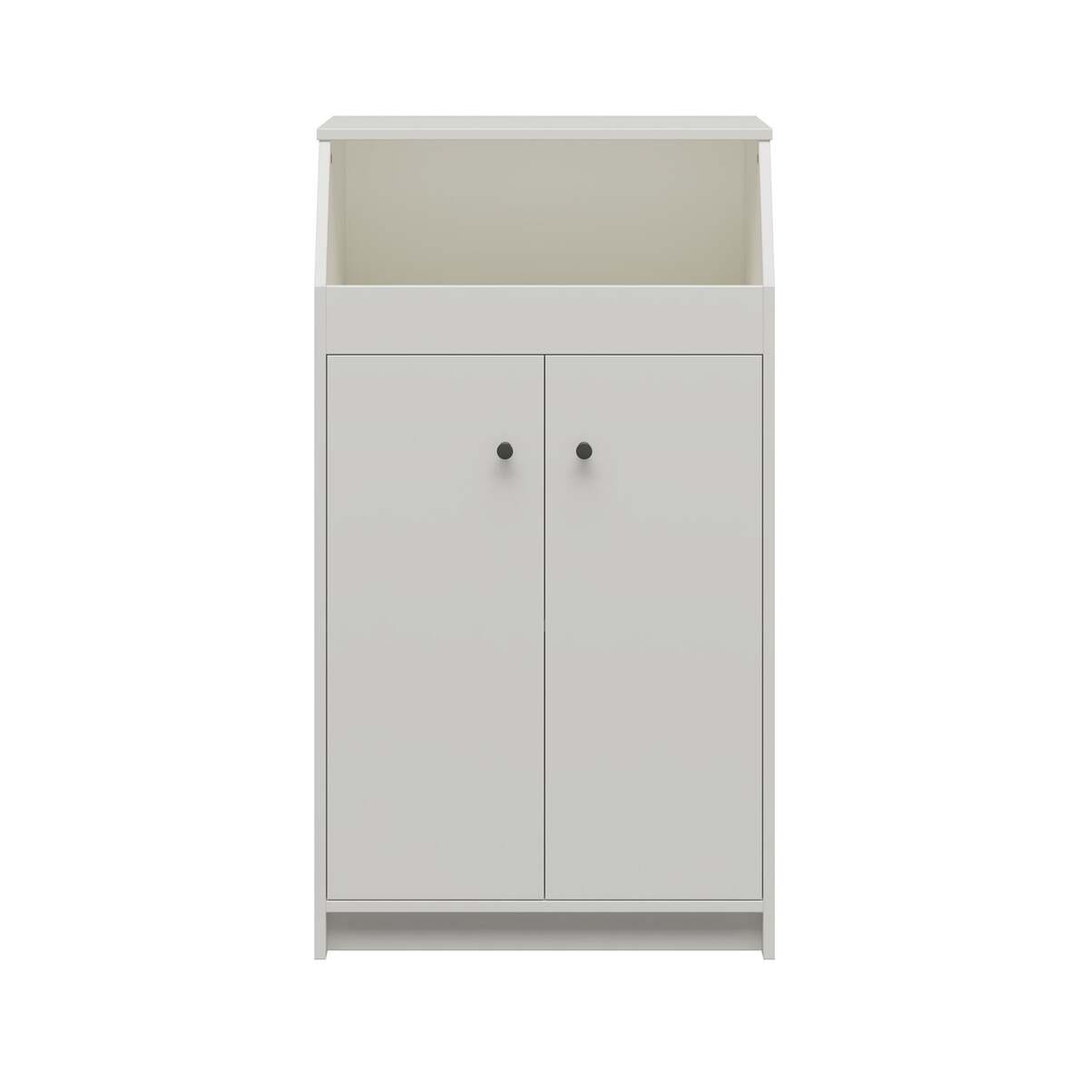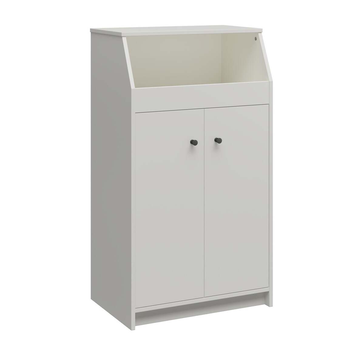 The Loft 2 Door Storage Tower featuresa large open cubby and two shelves (one fixed, one adjustable) behind the two cabinet doors