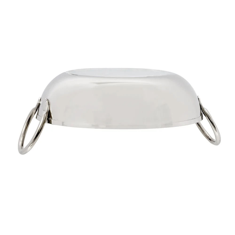 It is made of corrosion-resistant, durable stainless steel with a mirror finish that provides an attractive, upscale presentation. The dish has large loop handles on opposite sides that make it easy to transport and add visual interest to its appearance.