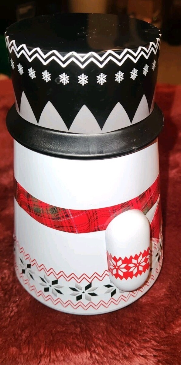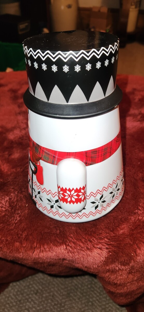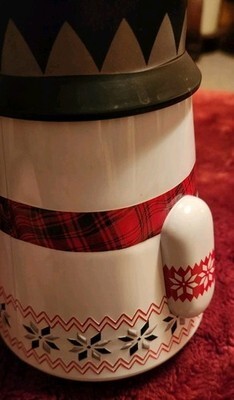Cute Walkers metal snowman tin. Has a rounded bottom so he wobbles a bit. Measures 7.5 inches tall.