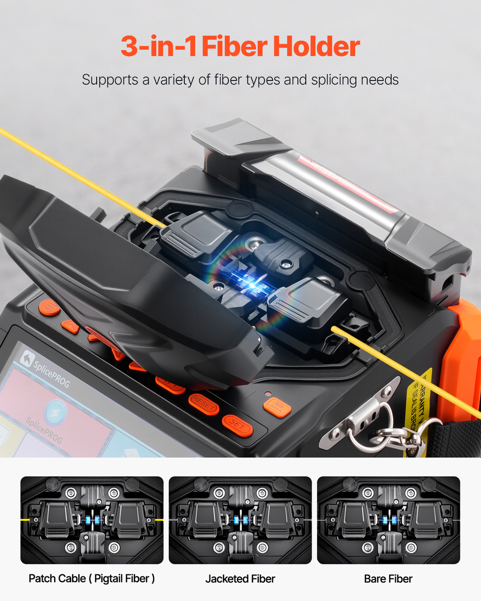 User-Friendly Designs: Our fiber optic fusion splicer features a 3-in-1 fiber holder, compatible with SM, MM, DS, NZDS, pigtail fiber, bare fiber, patch cable, etc. And it also includes built-in VFL and OPM Function, effectively measuring connection losses, verifying continuity, and helping evaluate fiber link transmission quality.