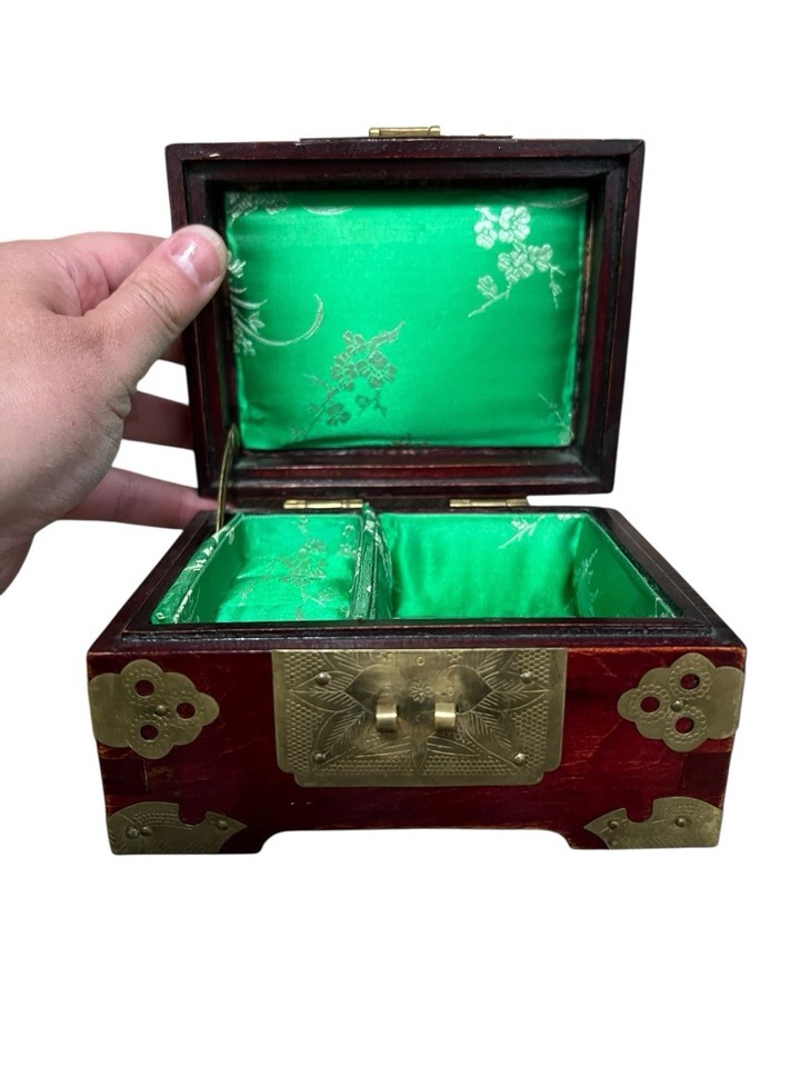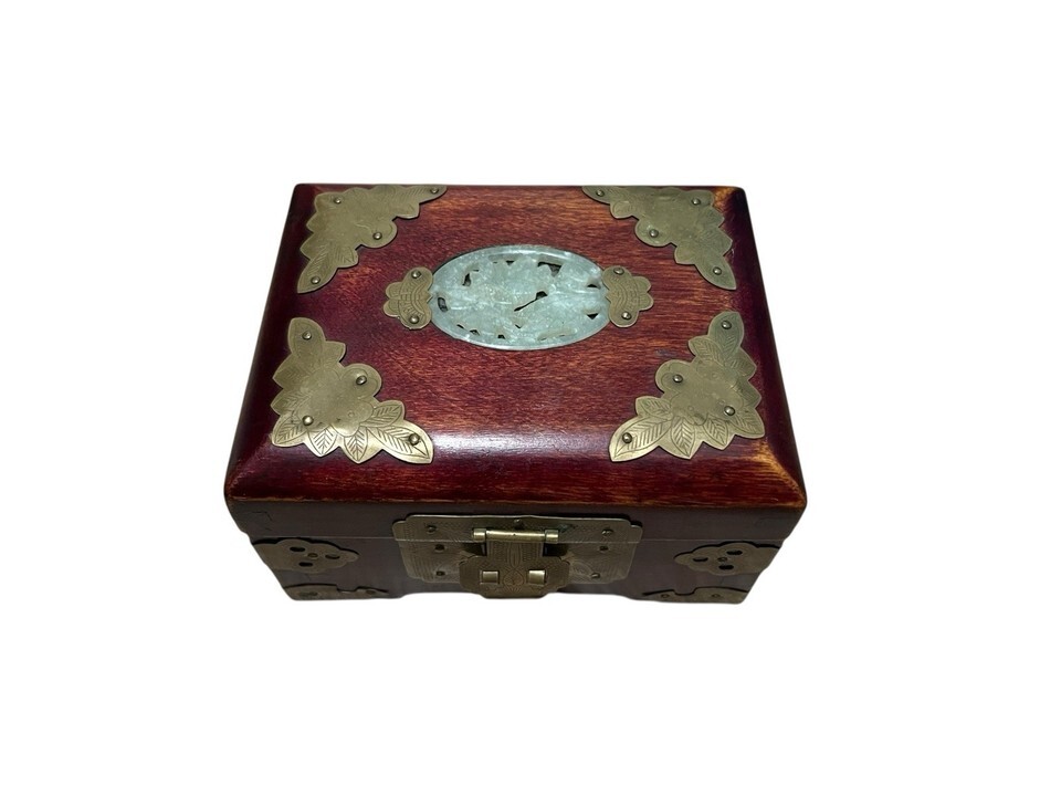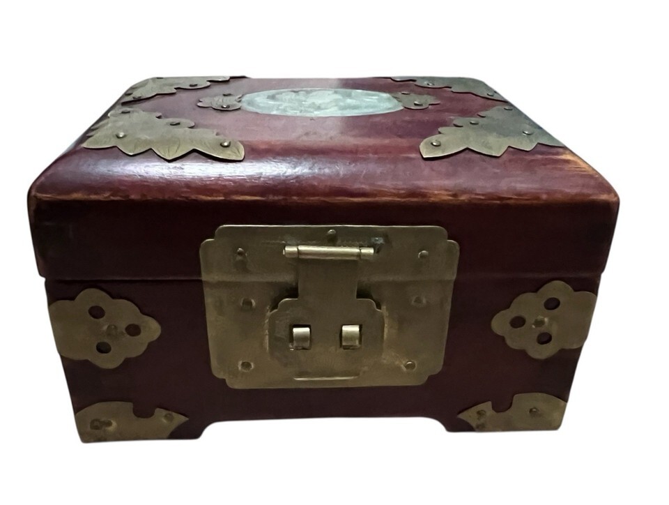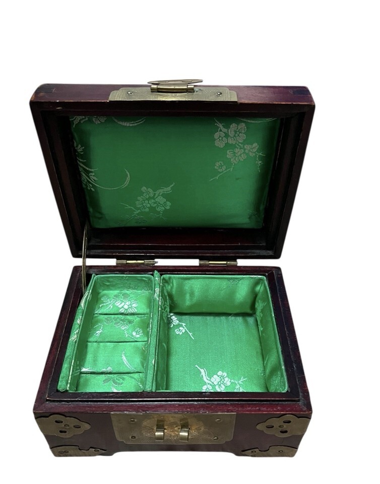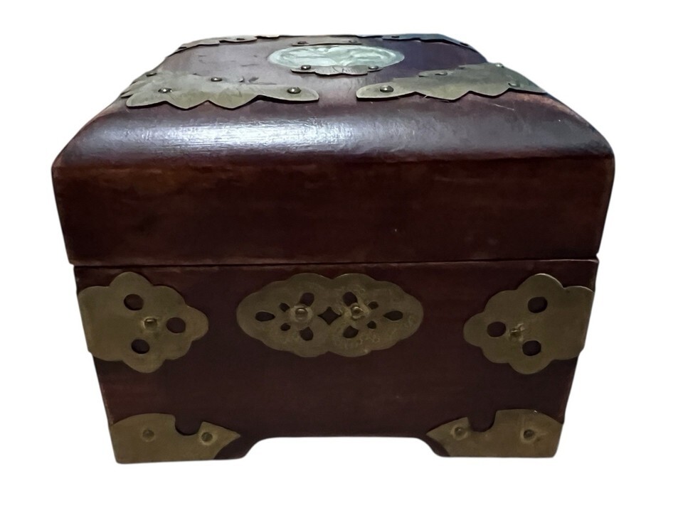 Vtg Wood & Brass Shanghai Chinese Oval Jade Inlay Padded Silk Jewelry Box Brown