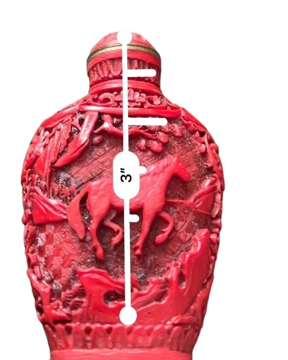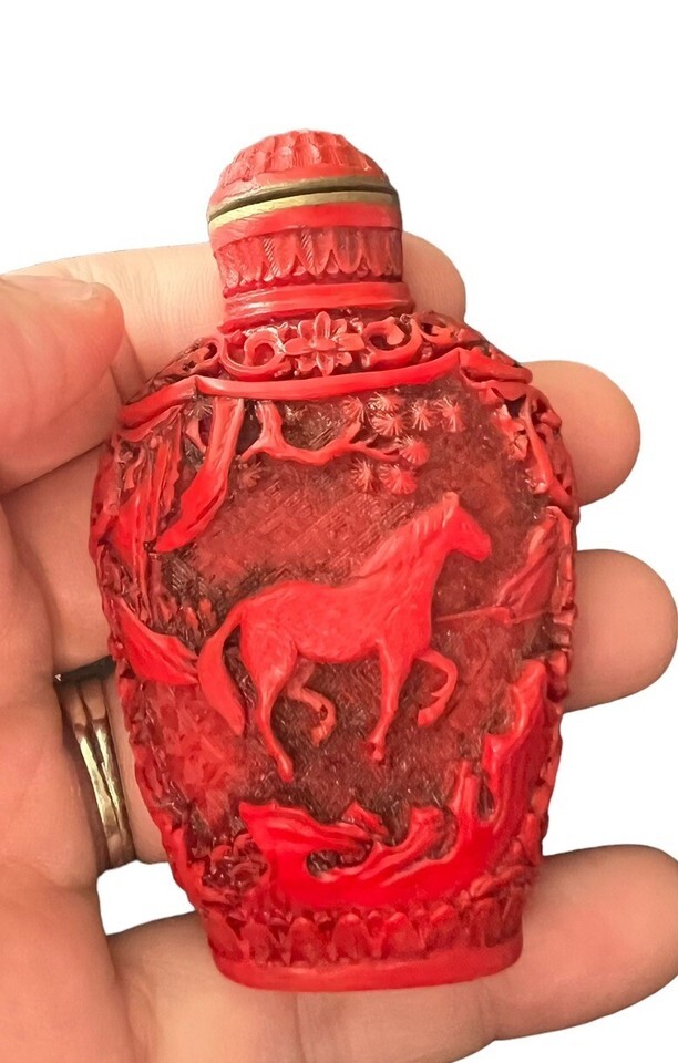 Antique Chinese Red Cinnabar Snuff Bottle Hand Carved Horse Floral Marked