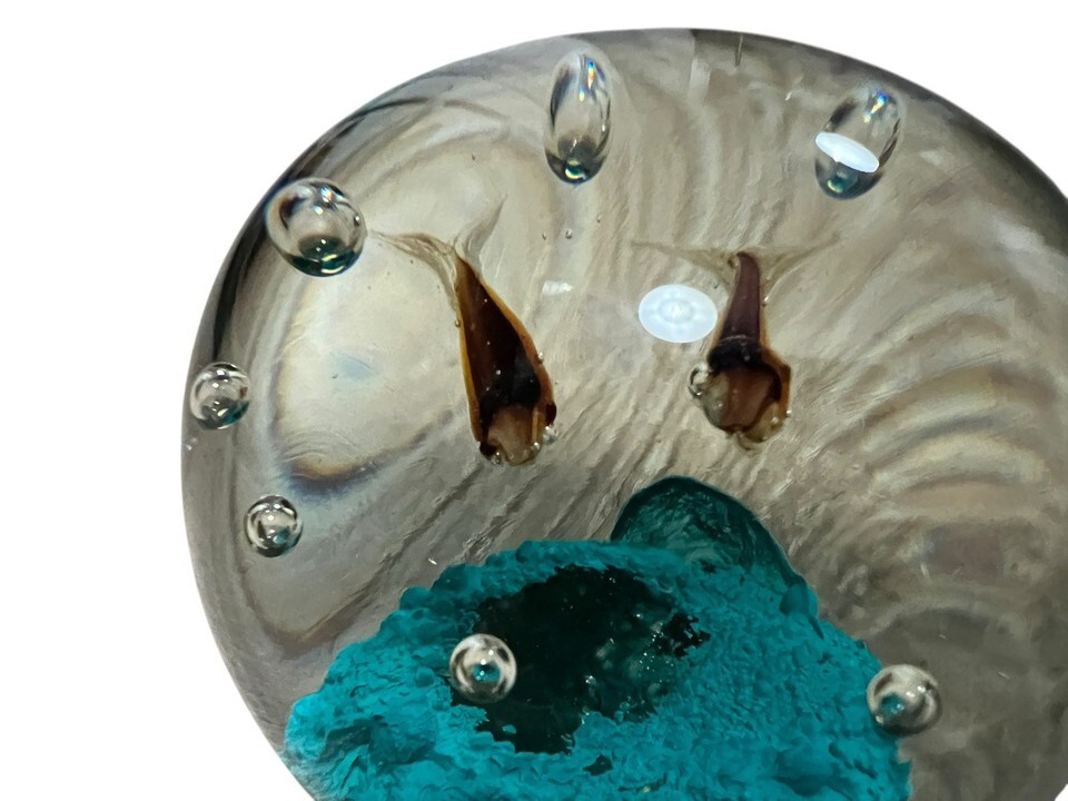 Glass paperweight with blue coral and fish with controlled bubbles