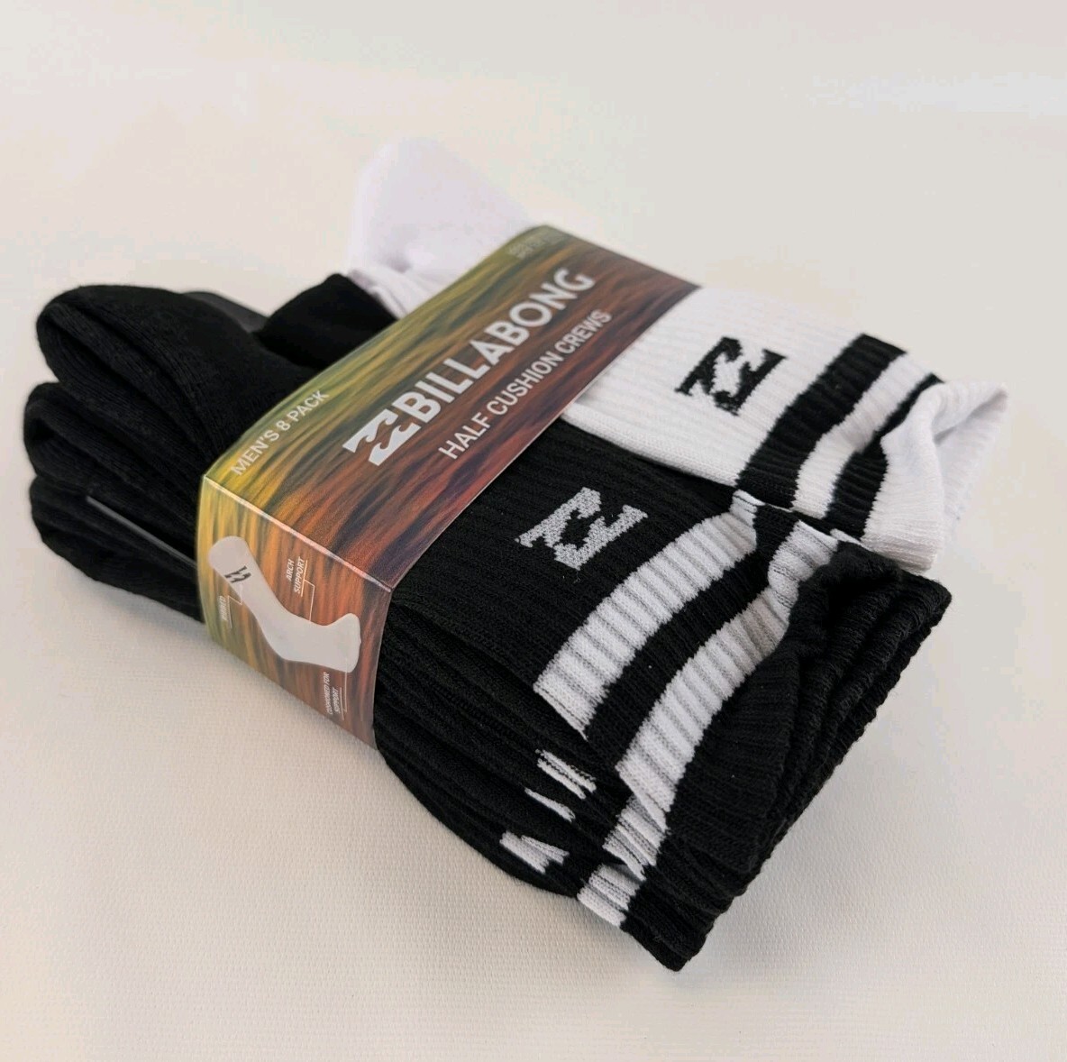 BILLABONG Half Cushion Crews Black White Crew Socks 10-13 Men's 8 Pack New