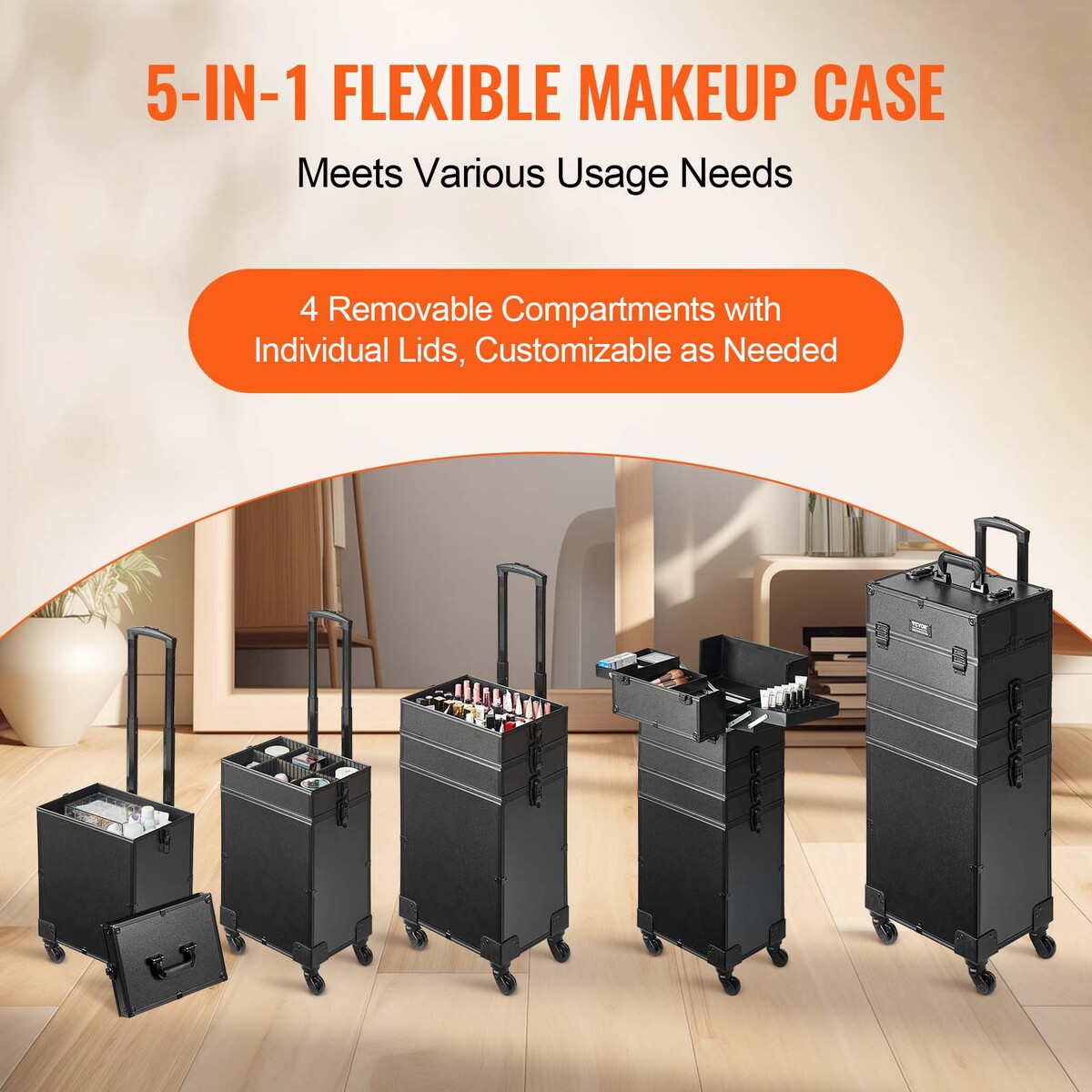 VEVOR 5 in 1 Makeup Train Case Aluminum Cosmetic Case, 360° Swivel Wheels, Black