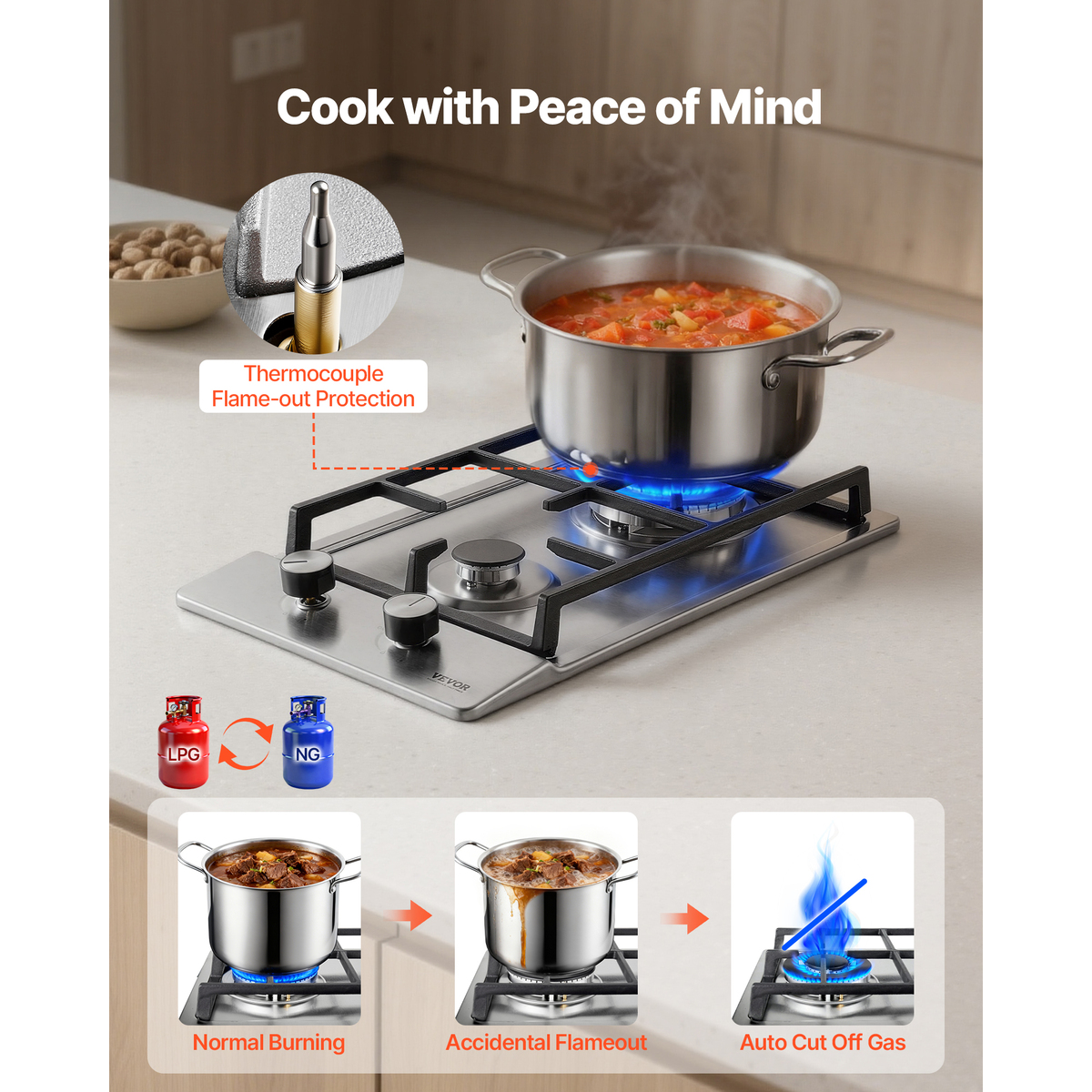 Automatic Shutdown Protection: This natural gas hob is equipped with a thermocouple flameout failure system to ensure safety. When the top needle inside the stove fails to detect a flame, the protection system is automatically triggered, shutting off the gas supply. This feature prevents gas leaks and ensures the safety of your family, and gives you peace of mind during the cooking process.