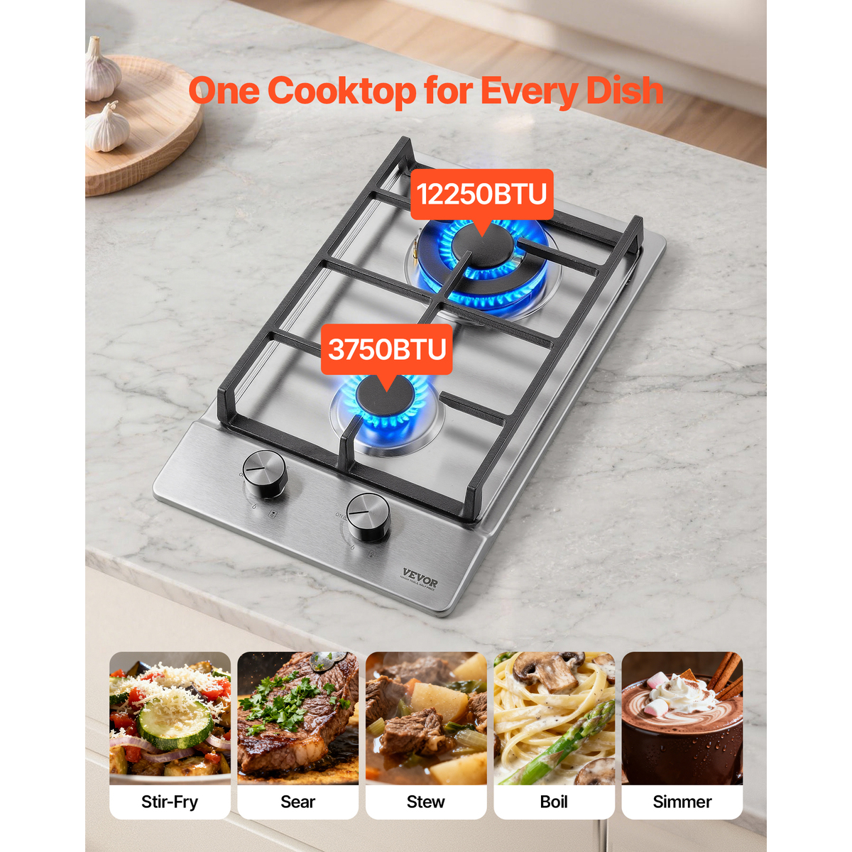 Highly Efficient Heating: VEVOR 12" built-in gas cooktop features 2 burners with different power levels: 3750BTU and 12250BTU. 12250BTU maximum power and 52% higher thermal efficiency ensure efficient and fast heating. Whether you are simmering or boiling, you can quickly complete your cooking with even heat distribution, and enjoy a delightful cooking experience.