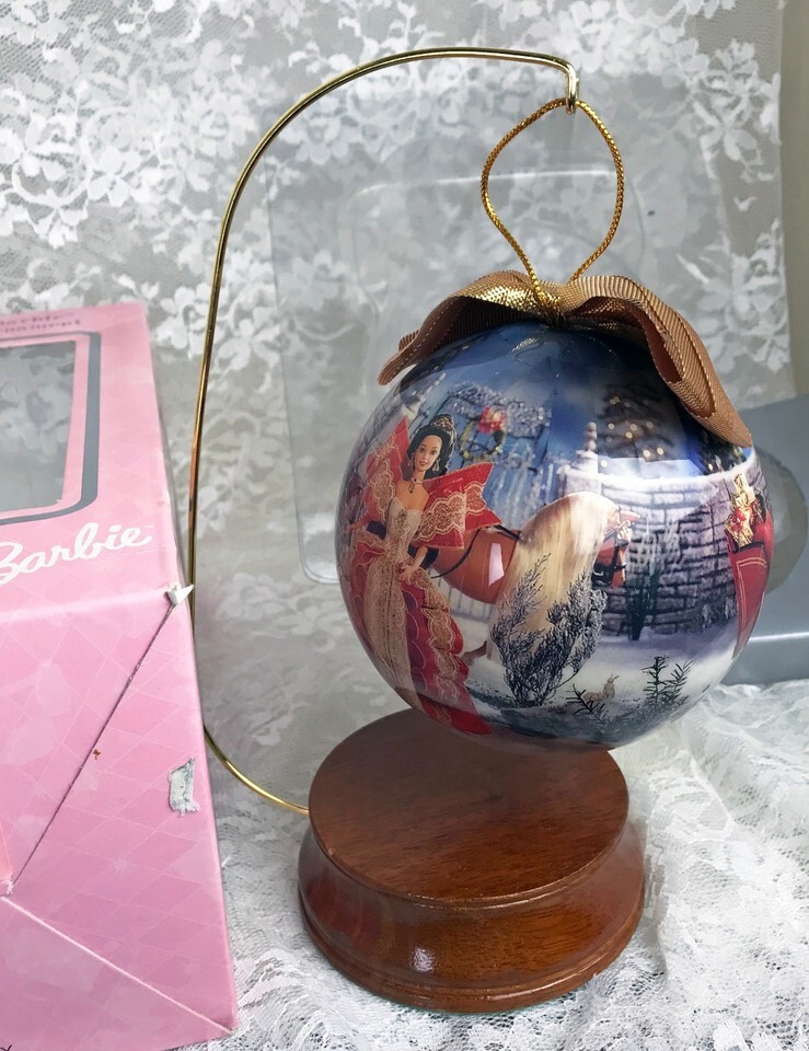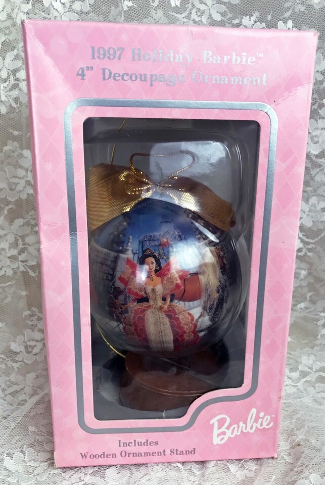 1997 Hallmark Holiday Barbie 4" Decoupage Ornament with Wooden Ornament Stand. Total height with stand is approximately 9". Excellent Used Condition - See photos for further description. Please note that we have two of this item. One has a nicer box than the other. The first one sold will get the nicer box.