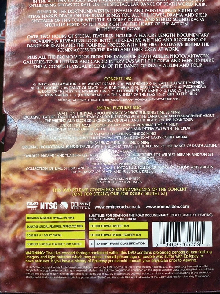 This is a rare 3-disc DVD of Iron Maiden's Death on the Road live concert, released in 2006. The DVD comes in a tall/DVD case with a slipcover and is a standard edition box set. It features additional scenes and is rated NR. The DVD is in NTSC video format and has a region code of DVD: 0/All, making it region-free and suitable for worldwide use. The language of the concert is English.