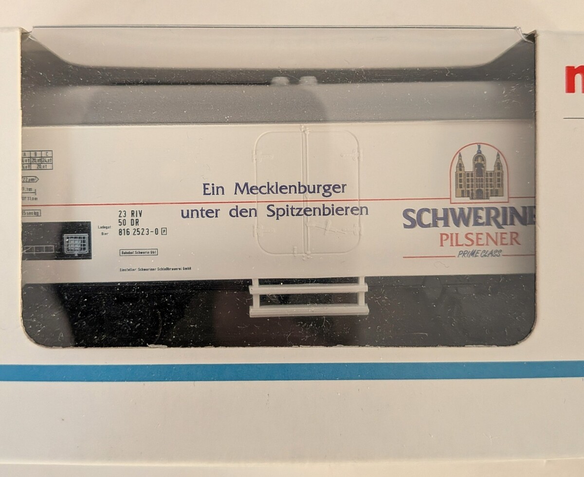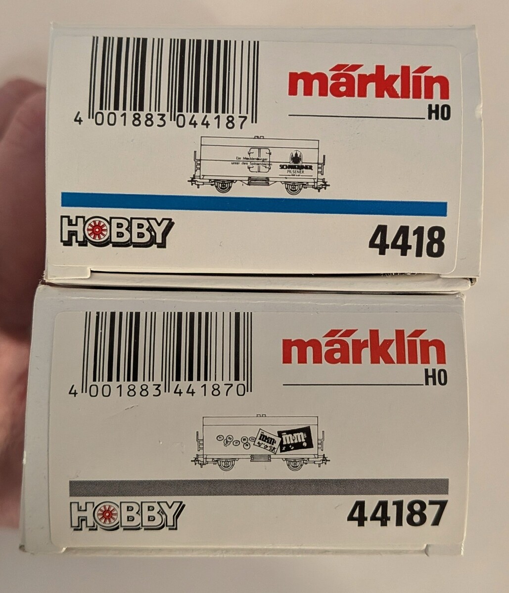 Marklin Marklin H0 set of two freight cars. One unit 4418 Schweriner beer box car and one unit 44187 M Ms box car. Both are new old stock (NOS), never on tracks in good scuff-free boxes.