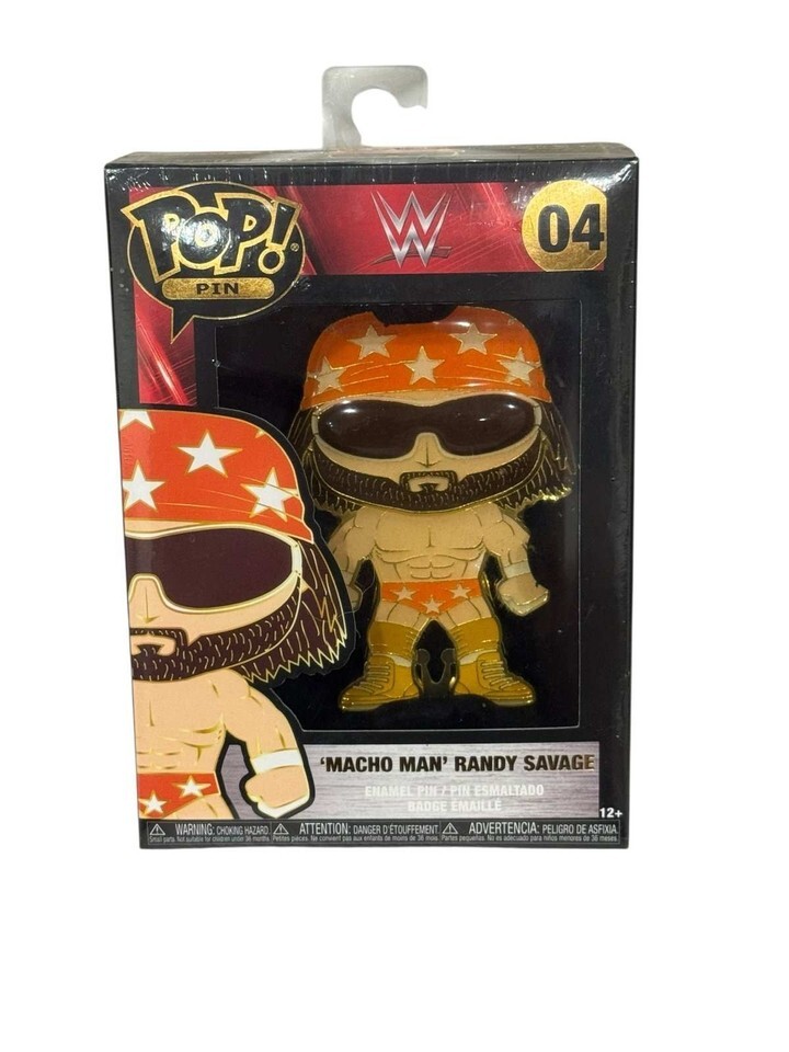 Funko Pop Pin WWE Macho Man Randy Savage #04 with bold enamel artwork and classic orange star gear. A must have for WWE and 80s wrestling collectors.