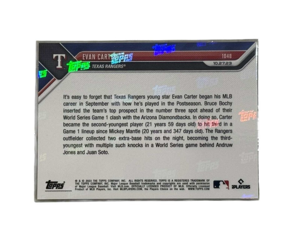 WORLD SERIES Evan Carter Topps NOW card celebrating his historic performance as the youngest player since Mickey Mantle to hit third in a World Series game. Official 2023 release capturing Carter?s rise as a postseason standout with multiple extra base hits. A must have card for Texas Rangers collectors and MLB prospect investors.