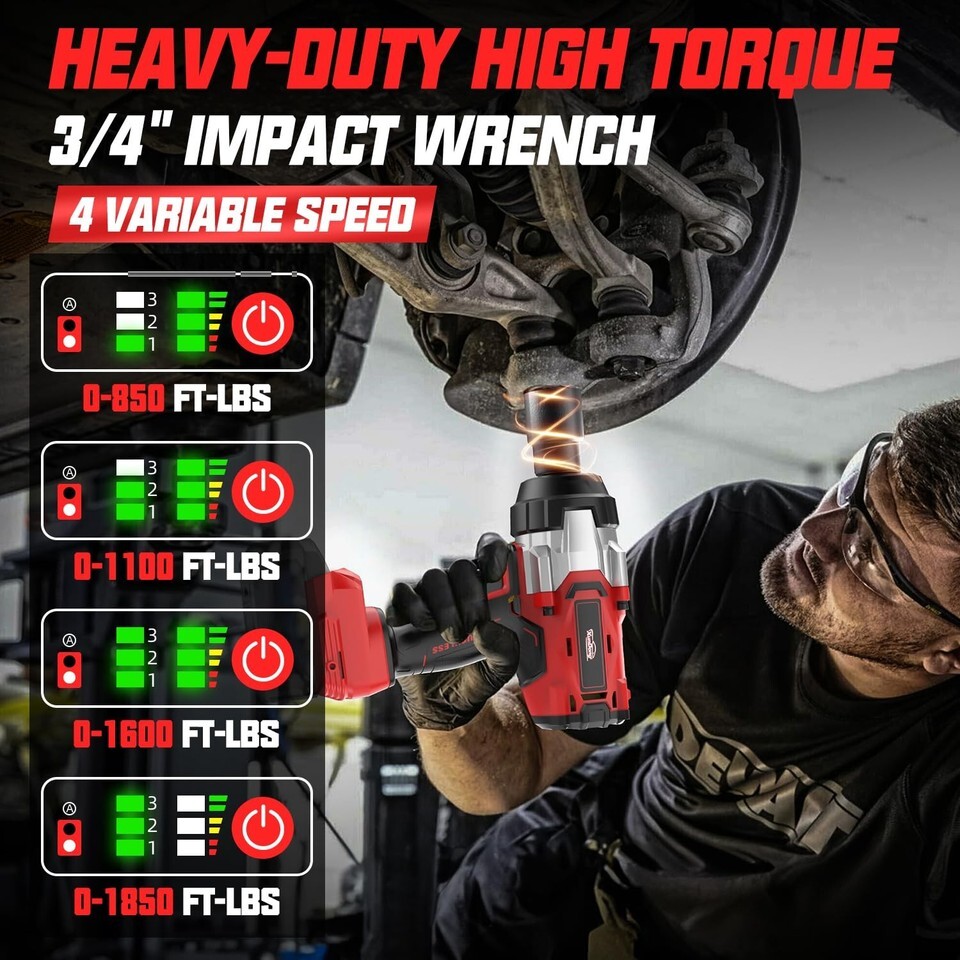 1850 FT-LBS Industry-Grade Power: Our high torque impact wrench delivers 1650Ft-lbs(max) tightening torque and 1850Ft-lbs loosening torque to rip through seized lug nuts, automotive repairs, and heavy machinery?all within seconds. Built for tire shops, construction crews, and hardcore DIYers.