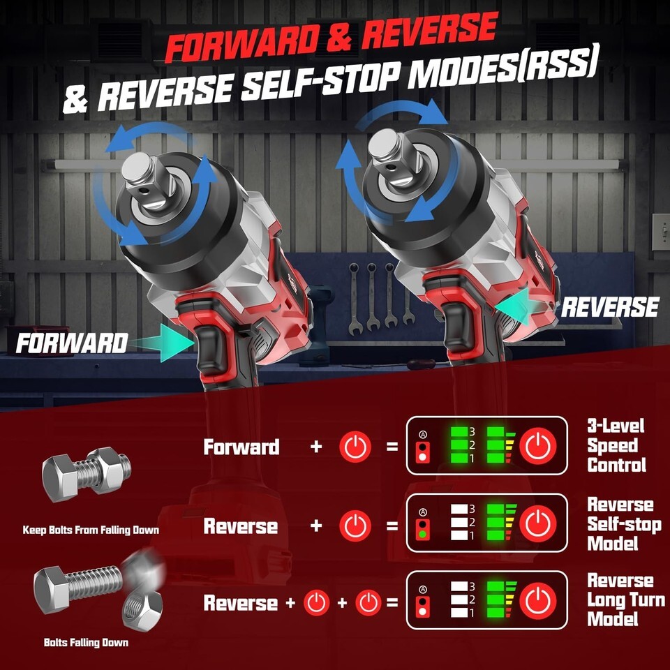 Smart Brushless Motor Precision Control: Maximize productivity with 4-speed settings (0-2000 RPM):featuring 3 forward speeds, 1 reverse speed and auto-stop technology. The brushless motor extends runtime by 60% vs. brushed motors while preventing over-tightening on delicate tasks like motorcycle engines.