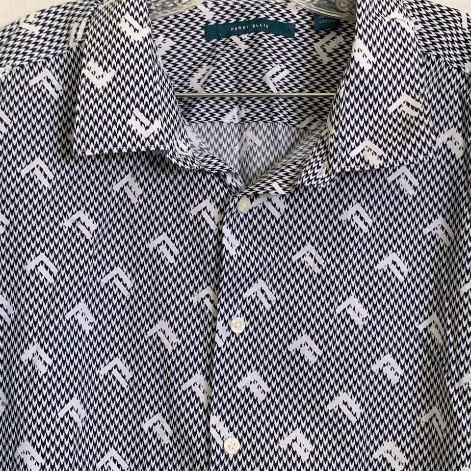 Keywords: Perry Ellis, men's shirt, 2XL, button-up, graphic print, short sleeve, casual wear, spring fashion, multicolor shirt, cotton shirt, relaxed fit, button-down collar, collared shirt, machine washable, pre-owned shirt