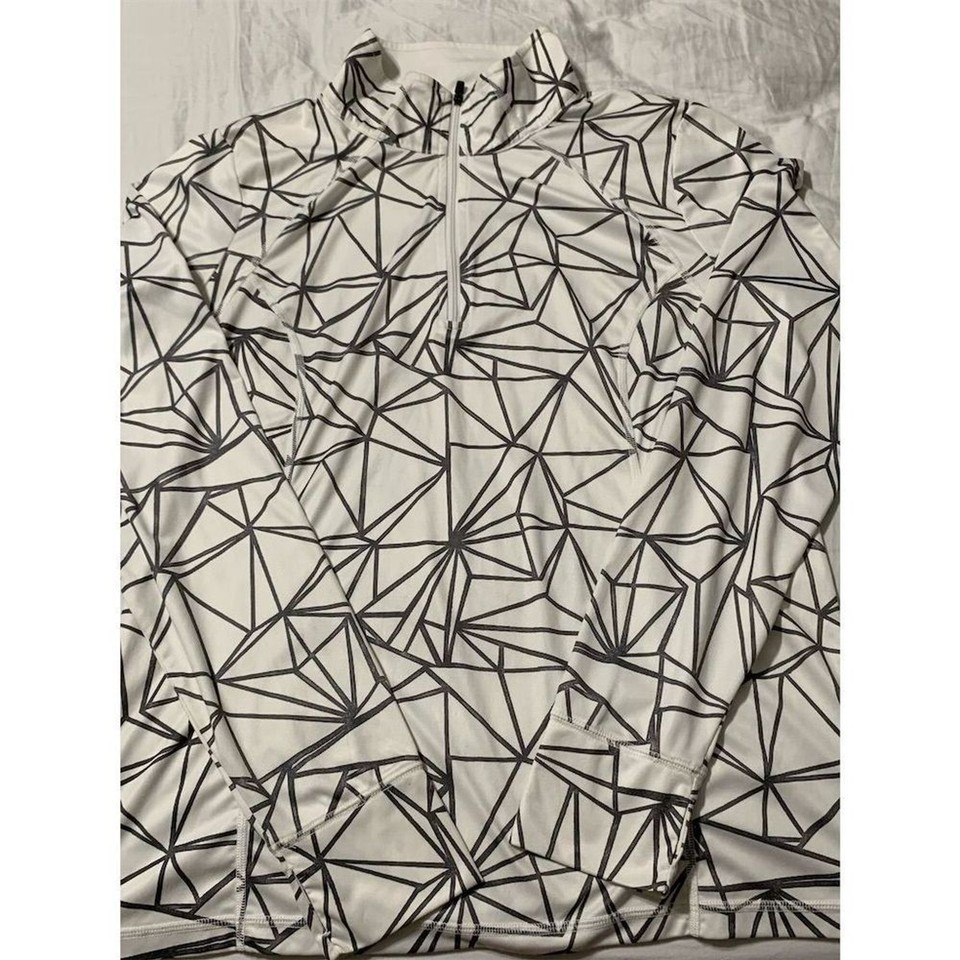Keywords: Xersion, women's pullover, multicolor, geometric pattern, activewear, fall fashion, high neck, long sleeves, half-zip, breathable fabric, machine washable, pre-owned, regular fit, medium size, comfortable.