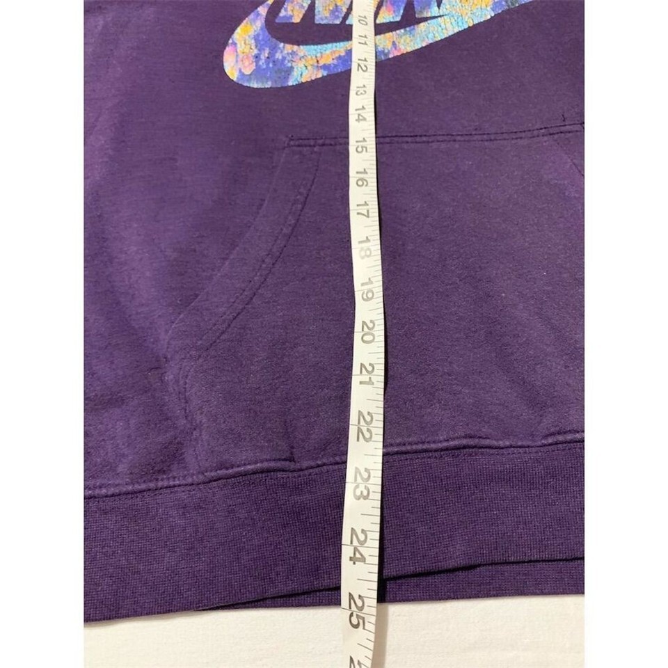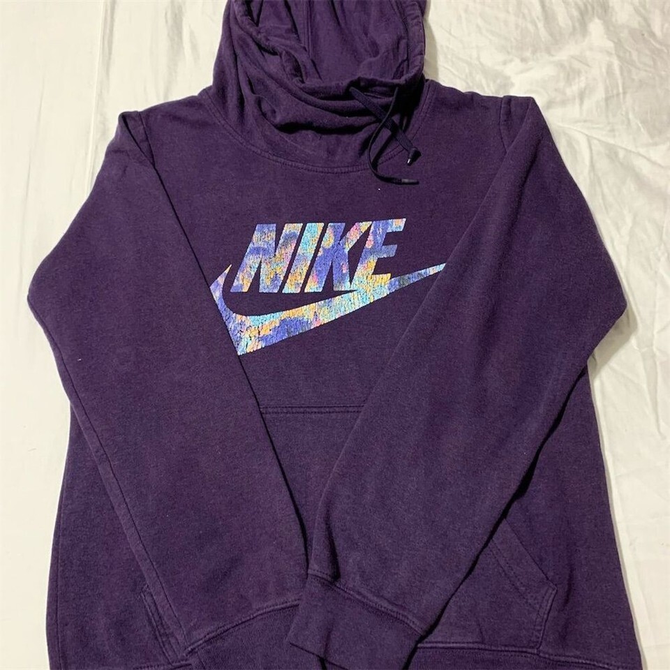 Keywords: Nike hoodie, women's pullover, purple hoodie, medium size, fall fashion, cotton blend, funnel neck, kangaroo pocket, casual wear, pre-owned Nike.