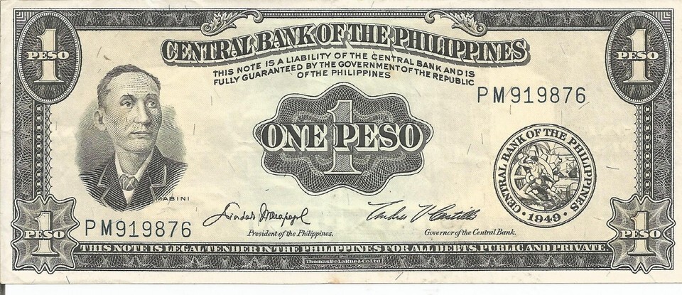 CENTRAL BANK OF THE PHILIPPINES 1 PESO Bill NOTE 1949 CIR. # 80