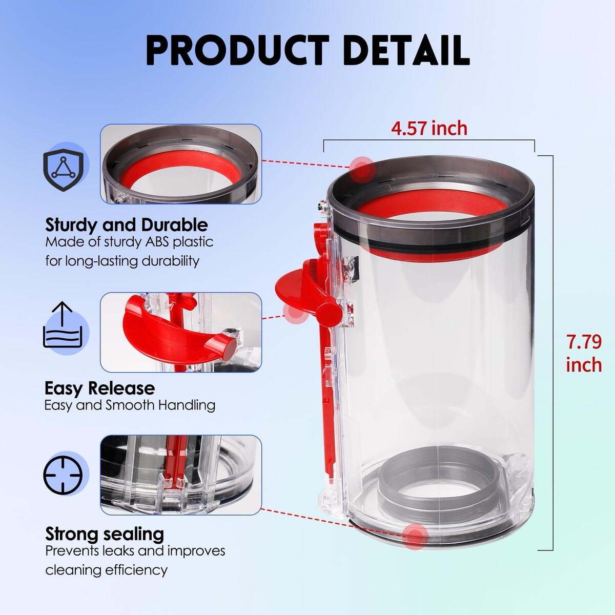 Replacement dust bin canister compatible with Dyson V11 and select V15 cordless vacuum models. Designed for easy release and emptying with an ergonomic handle to reduce hand strain during use.