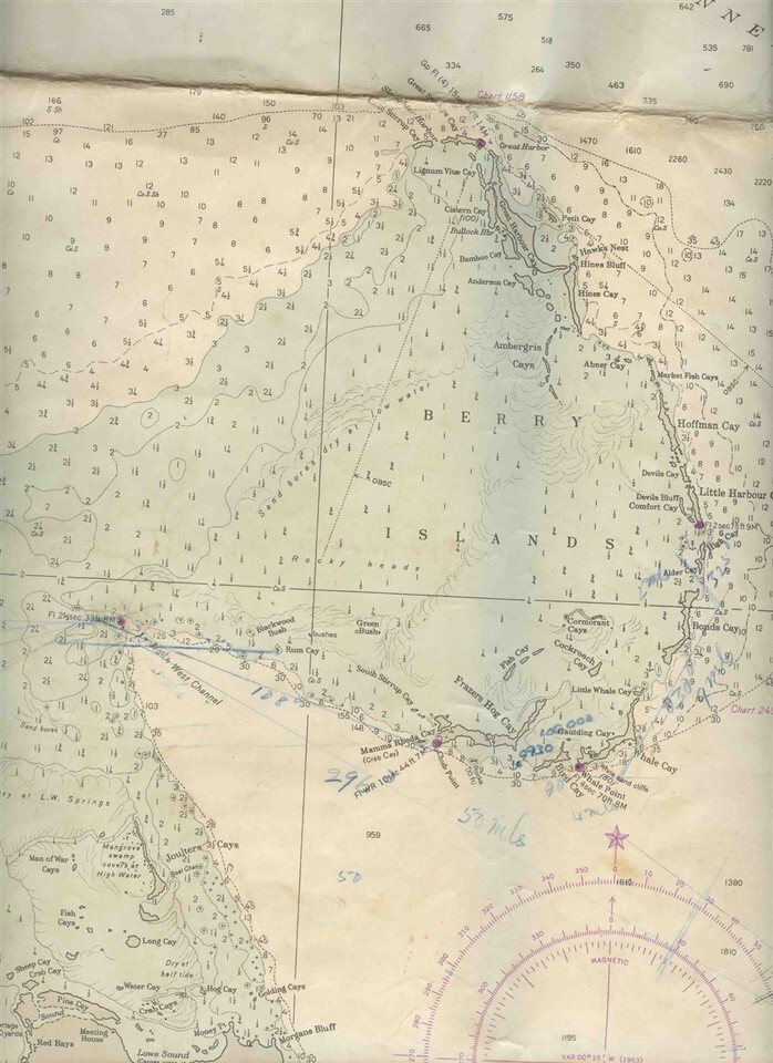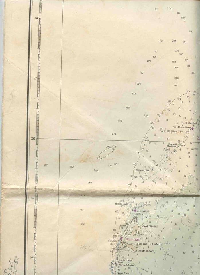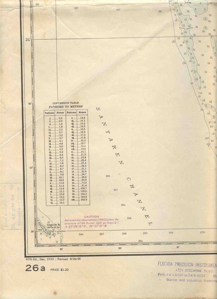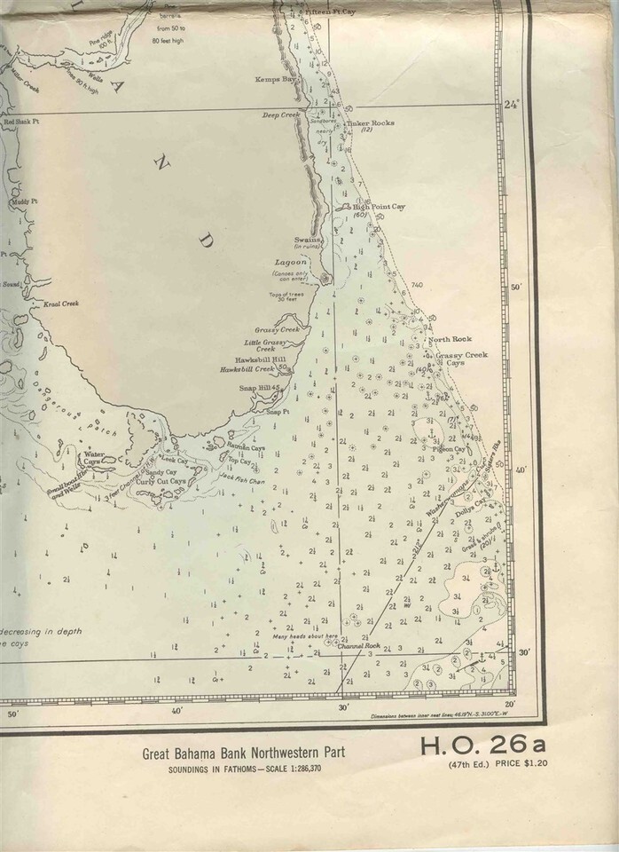 Opens to about 34" x 39" and the back is blank. West Indies Great Bahama Bank Map Northwestern Part H O 26A Rev 9/24/1956 . From British Surveys between 1836 and 1848. . Published at Washington DC, by the U S Navy Hydrographic Office under theAuthority of the Secretary of the NAvy.