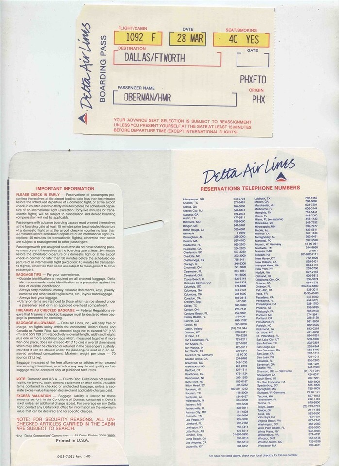 A Delta Airlines Ticket Jacket and Boarding Pass. Dated 1986