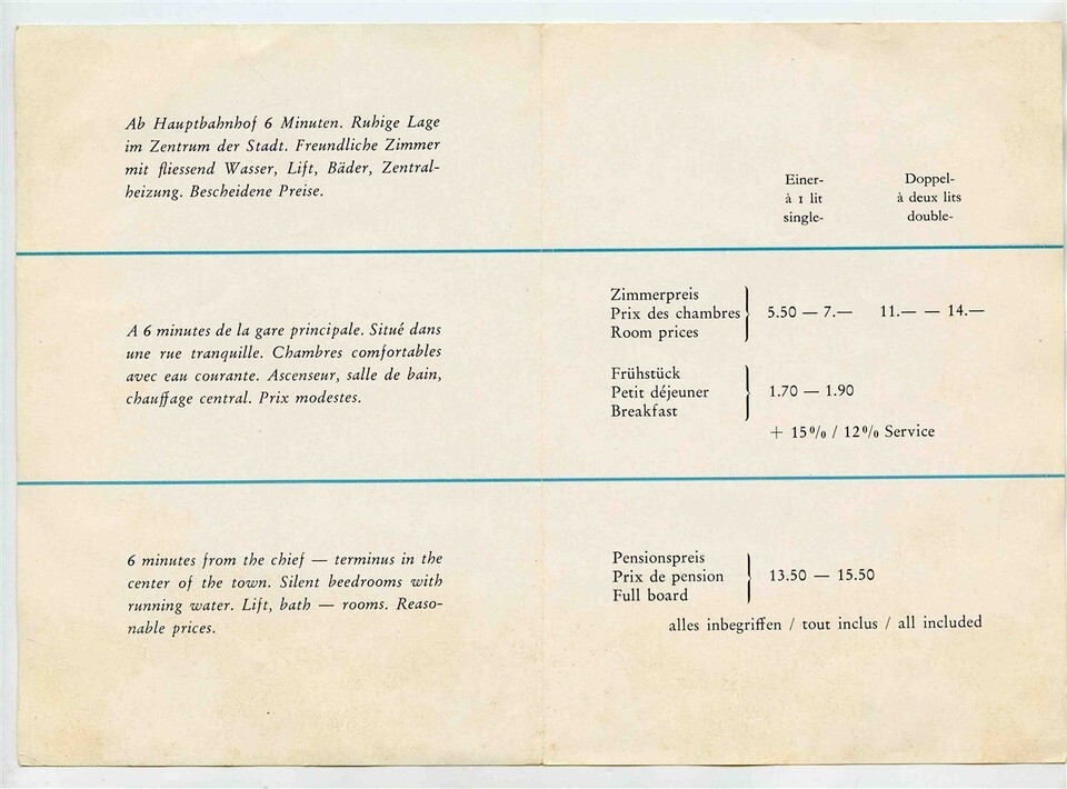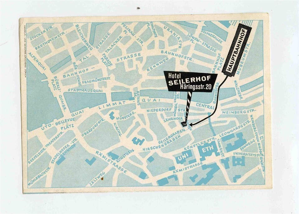 A small 4 page Hotel Seilerhof Hospiz Brochure with Map and room rates. Located in Zurich Switzerland, circa 1950's