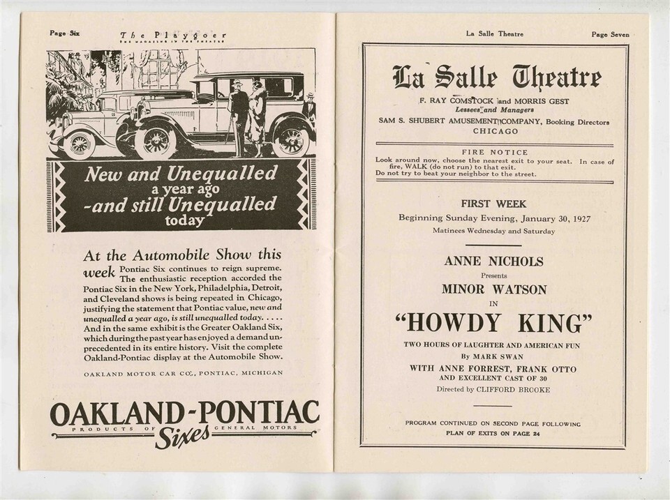 Shubert LaSalle Theatre Playgoer Howdy King 1927 Program Chicago Illinois