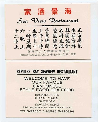 A 3" x 4 3/4" two side business card. One side in English and the other in Chinese. Repulse Bay Sea View Restaurant Hong Kong China