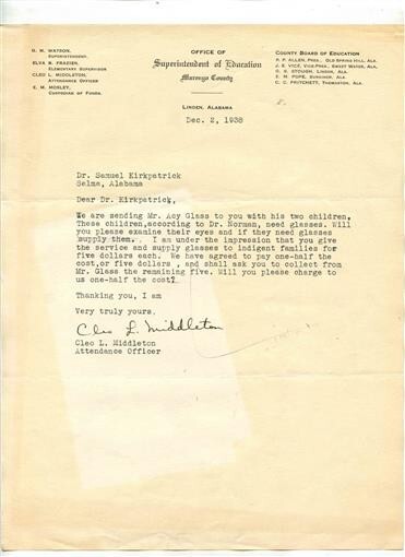 An original single page letter with blank back. Superintendent of Education Marengo County Linden Alabama Signed Letter 1938. A referral letter for 2 children to get glasses