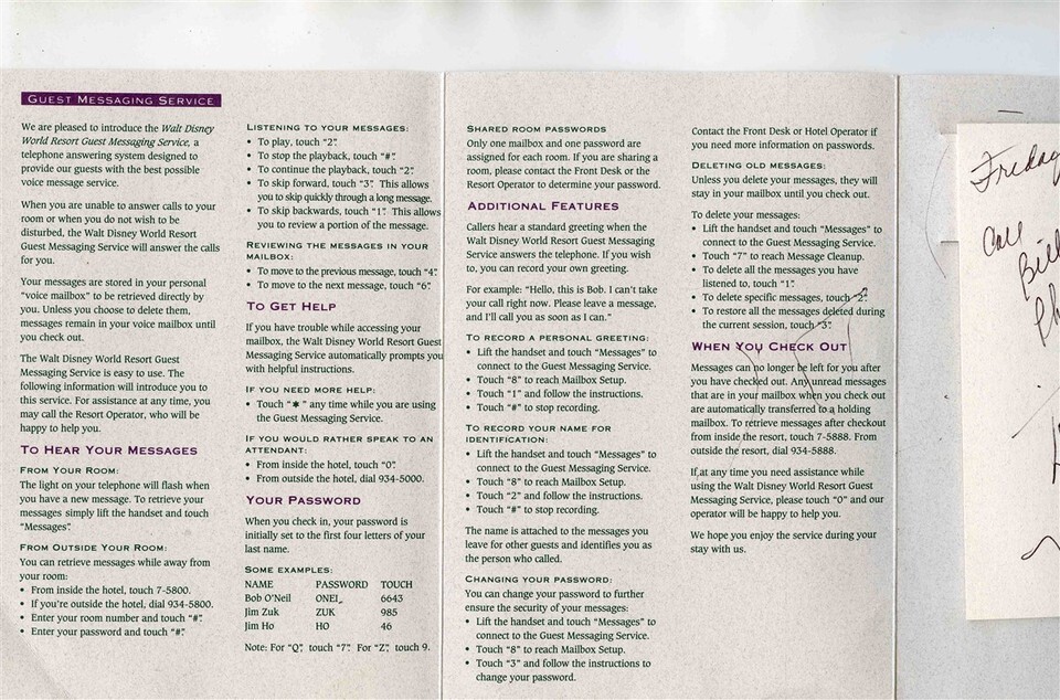 A 6 panel fold out. Disney's Port Orleans Resort Telephone Instructions Note Pad 1990s WDW