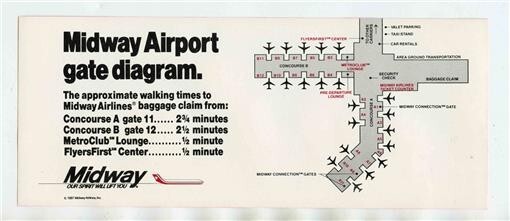 A single page with a blank bright red back. Midway Airlines Gate Diagram Midway Airport Chicago Illinois HAs walking times to Baggage Claim from various points. Measures about 3 1/2" x 8 1/2"